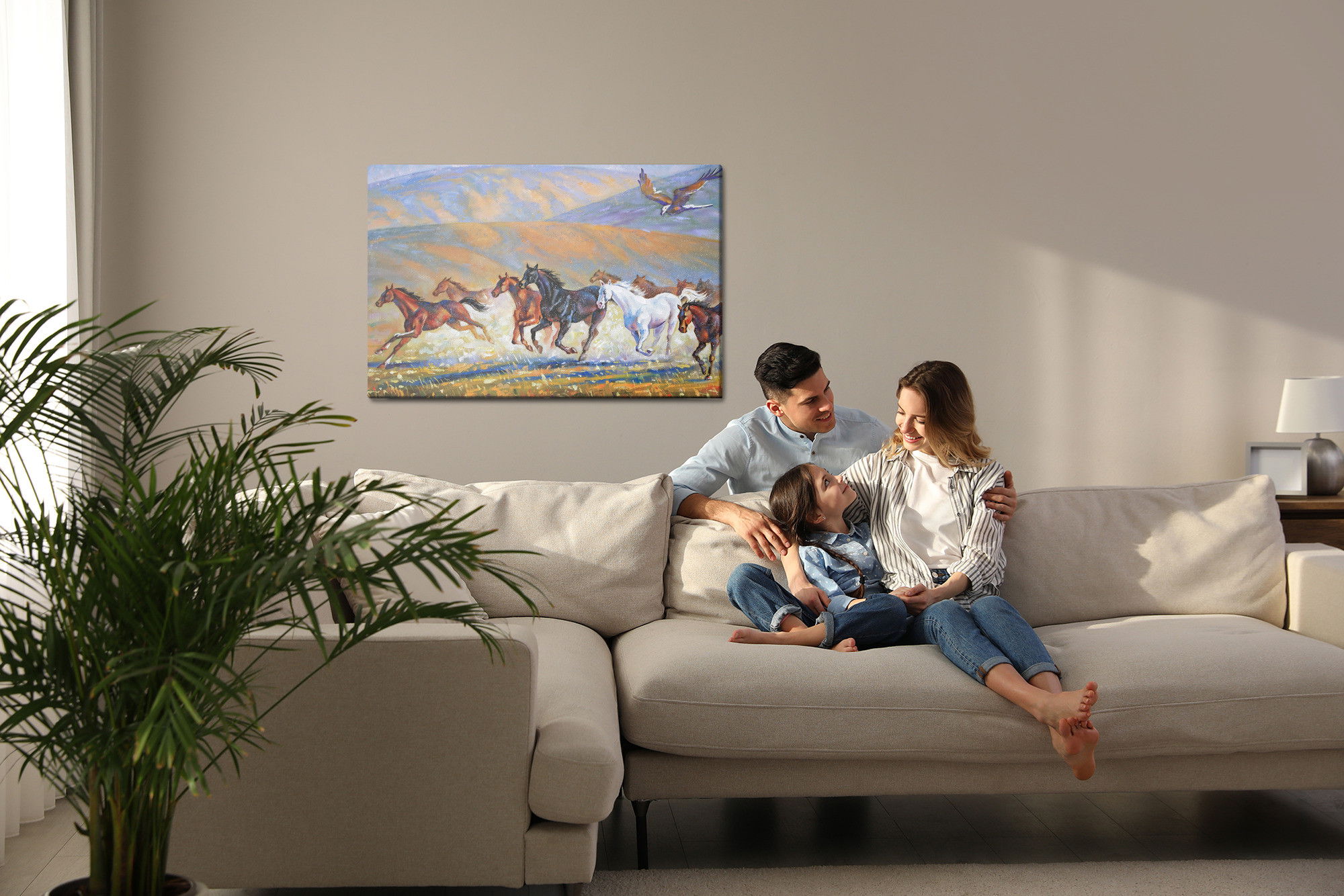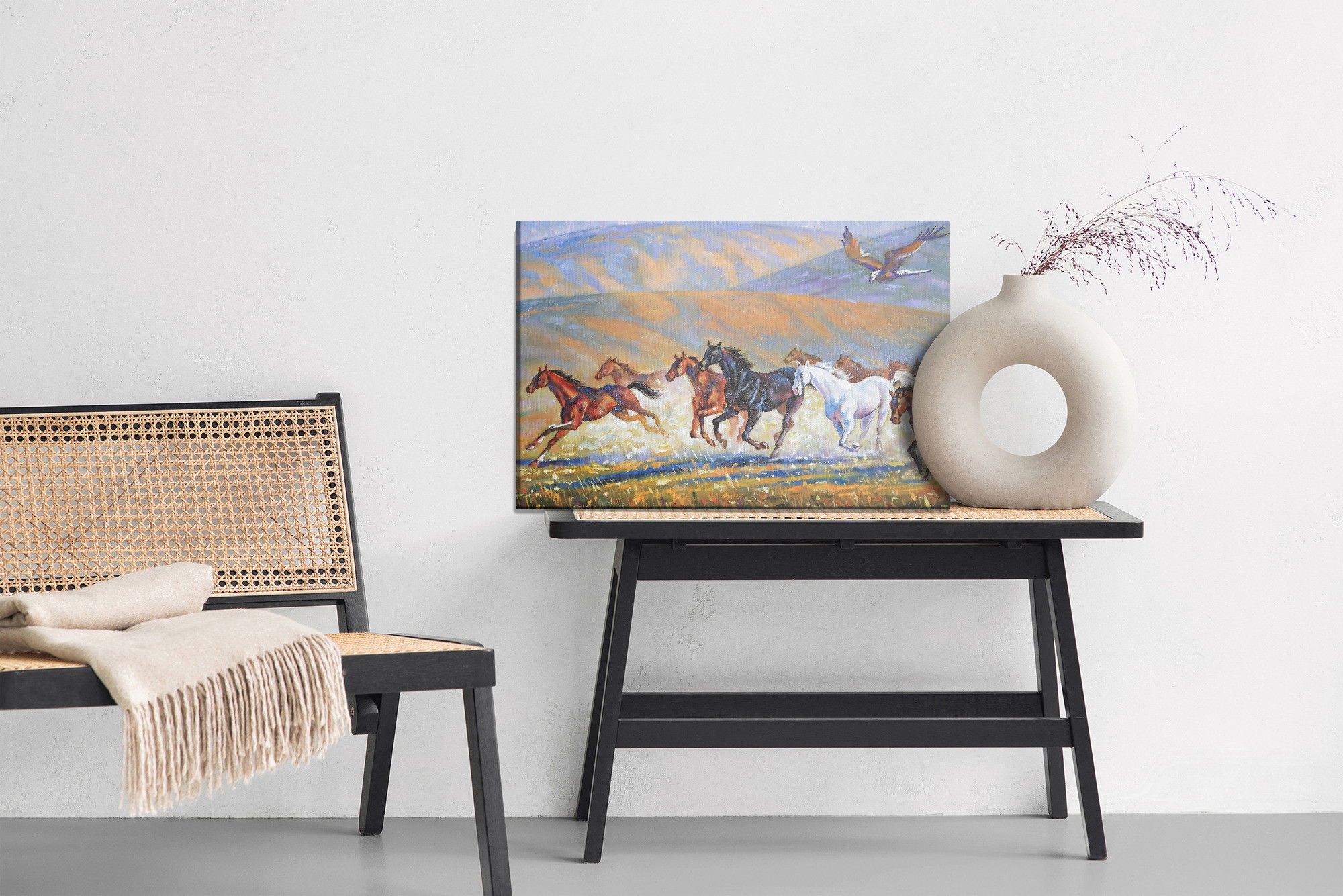 Varje tavla monteras på en massiv fururam. Format upp till 70×50 cm har en ram på 15 mm, medan format från 90×60 cm och uppåt har en ram på 20 mm. Den exakta dukspänningen gör att tavlan håller sin form över tid. Motivet Horses galloping trycks runt hela ramen vilket ger ett stilrent galleriuttryck där tavlan är lika vacker från sidan som framifrån. Kombinationen av rak dukspänning, rena linjer och korrekt tryck ger en professionell finish.