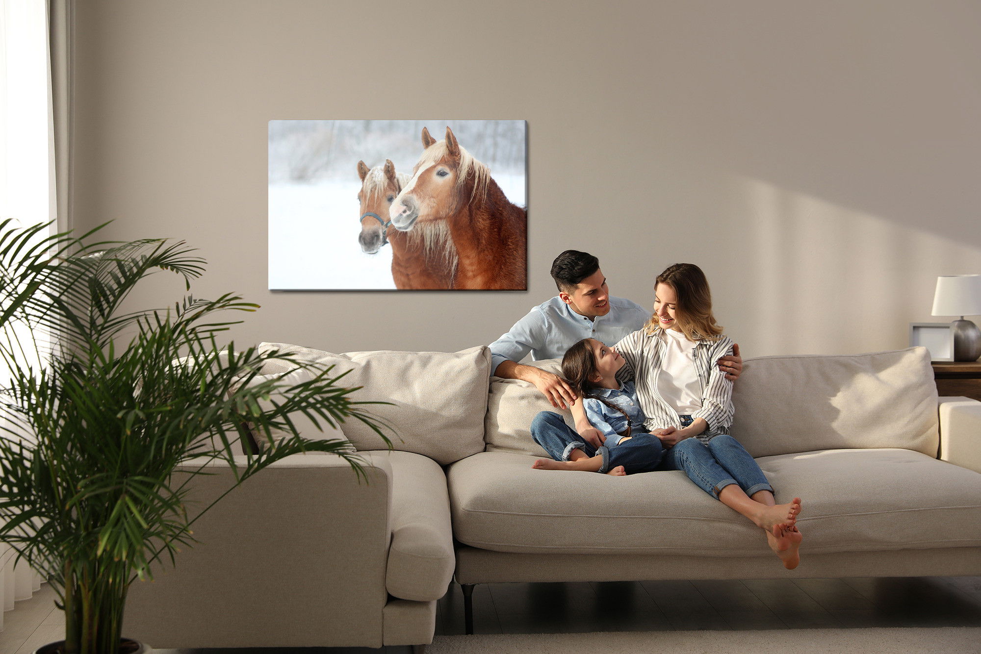 Motivet Horses in the snow återges med hög färgprecision och detaljrikedom tack vare HP Latex-teknologi. Trycket sker med vattenbaserade, luktfria och GREENGUARD Gold-certifierade bläck som ger en upplösning på upp till 300 DPI. Färgerna är UV-beständiga och behåller sin styrka även i ljusa rum, vilket gör tavlan lämplig för både hem- och offentliga miljöer.