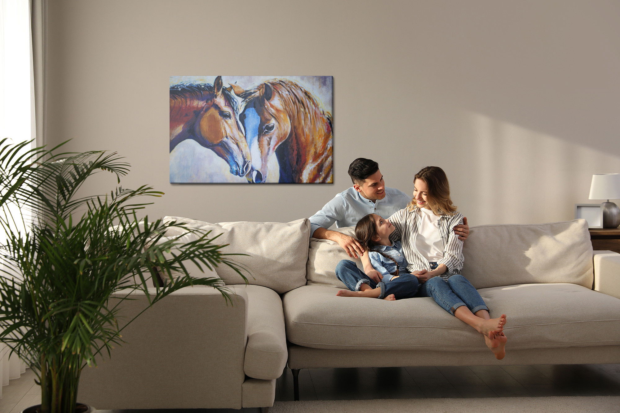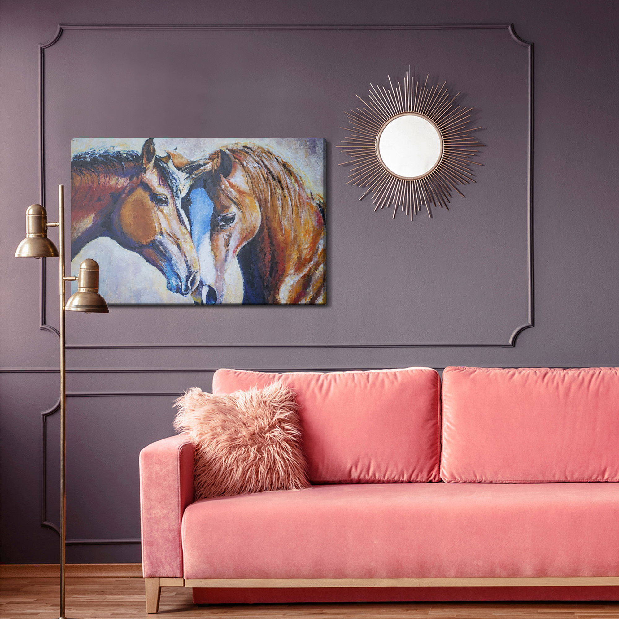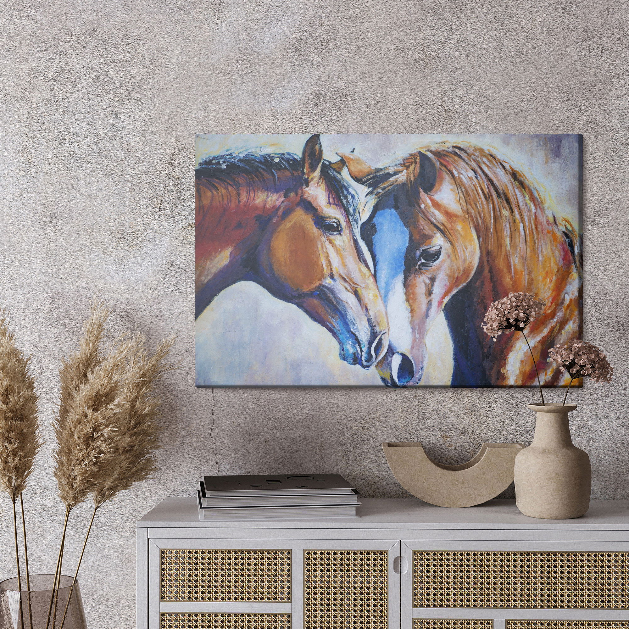 Varje tavla monteras på en massiv fururam. Format upp till 70×50 cm har en ram på 15 mm, medan format från 90×60 cm och uppåt har en ram på 20 mm. Den exakta dukspänningen gör att tavlan håller sin form över tid. Motivet Horses in watercolour trycks runt hela ramen vilket ger ett stilrent galleriuttryck där tavlan är lika vacker från sidan som framifrån. Kombinationen av rak dukspänning, rena linjer och korrekt tryck ger en professionell finish.