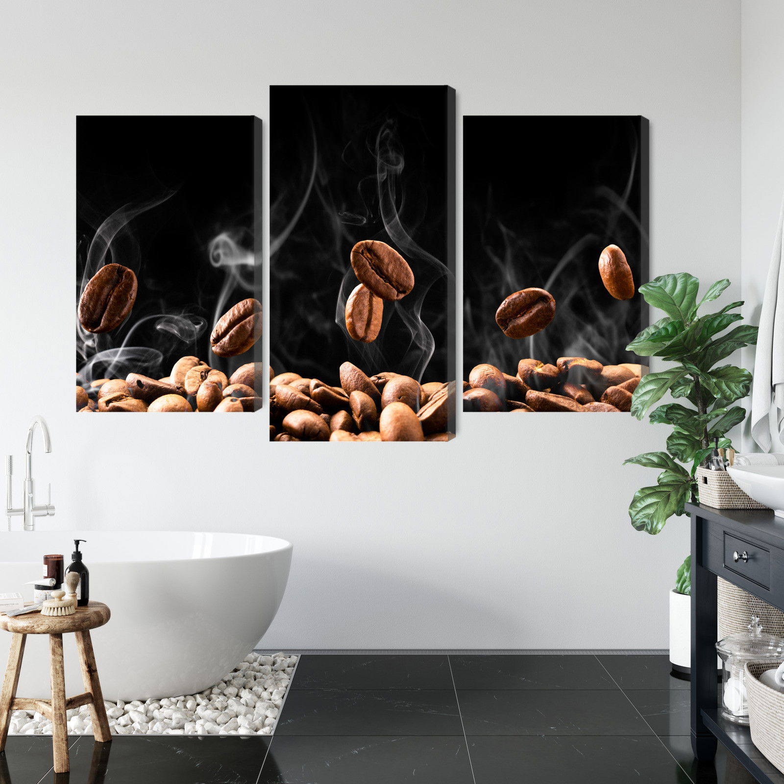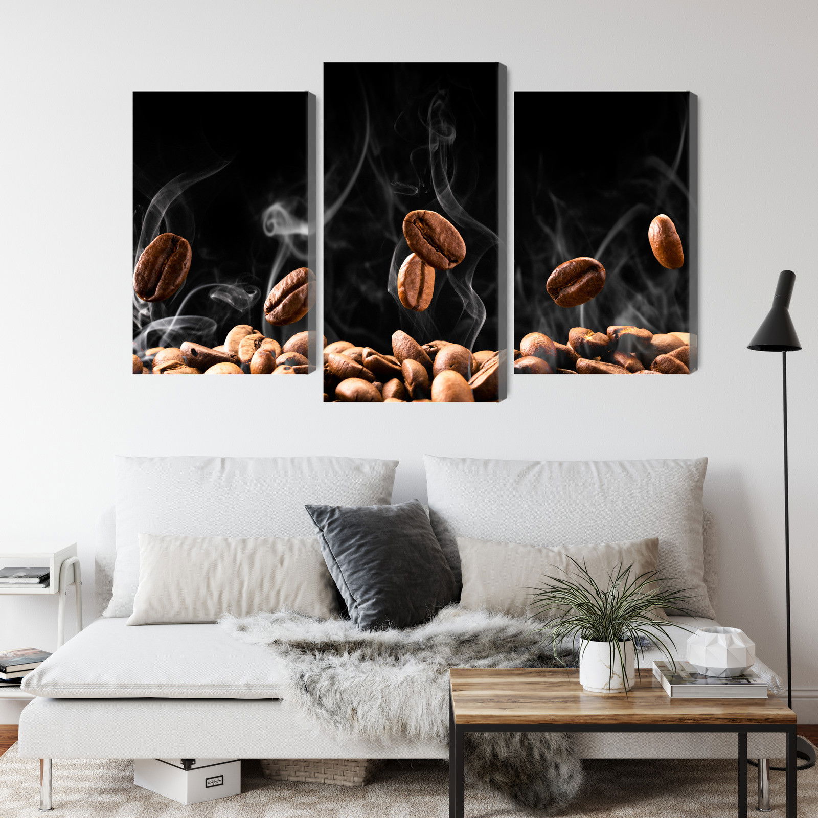 Varje tavla monteras på en massiv fururam. Format upp till 70×50 cm har en ram på 15 mm, medan format från 90×60 cm och uppåt har en ram på 20 mm. Den exakta dukspänningen gör att tavlan håller sin form över tid. Motivet Hot coffee beans trycks runt hela ramen vilket ger ett stilrent galleriuttryck där tavlan är lika vacker från sidan som framifrån. Kombinationen av rak dukspänning, rena linjer och korrekt tryck ger en professionell finish.
