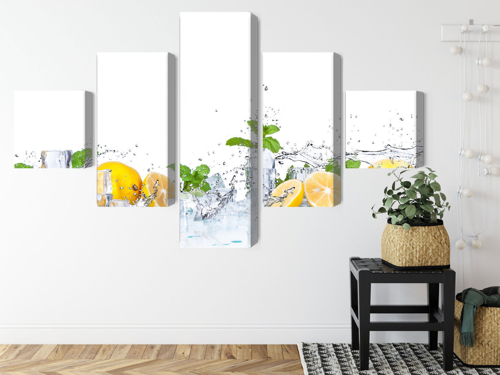 Motivet Mint leaves with lemons återges med hög färgprecision och detaljrikedom tack vare HP Latex-teknologi. Trycket sker med vattenbaserade, luktfria och GREENGUARD Gold-certifierade bläck som ger en upplösning på upp till 300 DPI. Färgerna är UV-beständiga och behåller sin styrka även i ljusa rum, vilket gör tavlan lämplig för både hem- och offentliga miljöer.