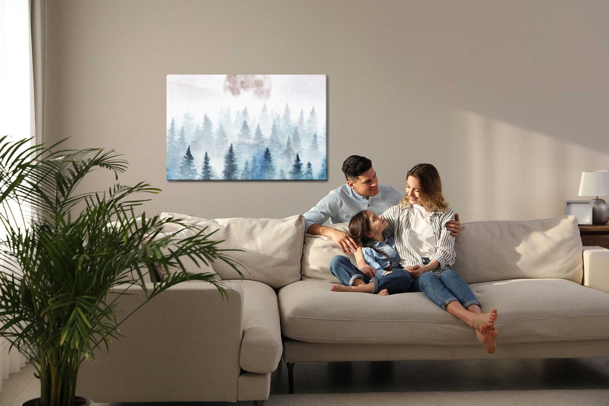 Varje tavla monteras på en massiv fururam. Format upp till 70×50 cm har en ram på 15 mm, medan format från 90×60 cm och uppåt har en ram på 20 mm. Den exakta dukspänningen gör att tavlan håller sin form över tid. Motivet Moon above misty trees trycks runt hela ramen vilket ger ett stilrent galleriuttryck där tavlan är lika vacker från sidan som framifrån. Kombinationen av rak dukspänning, rena linjer och korrekt tryck ger en professionell finish.