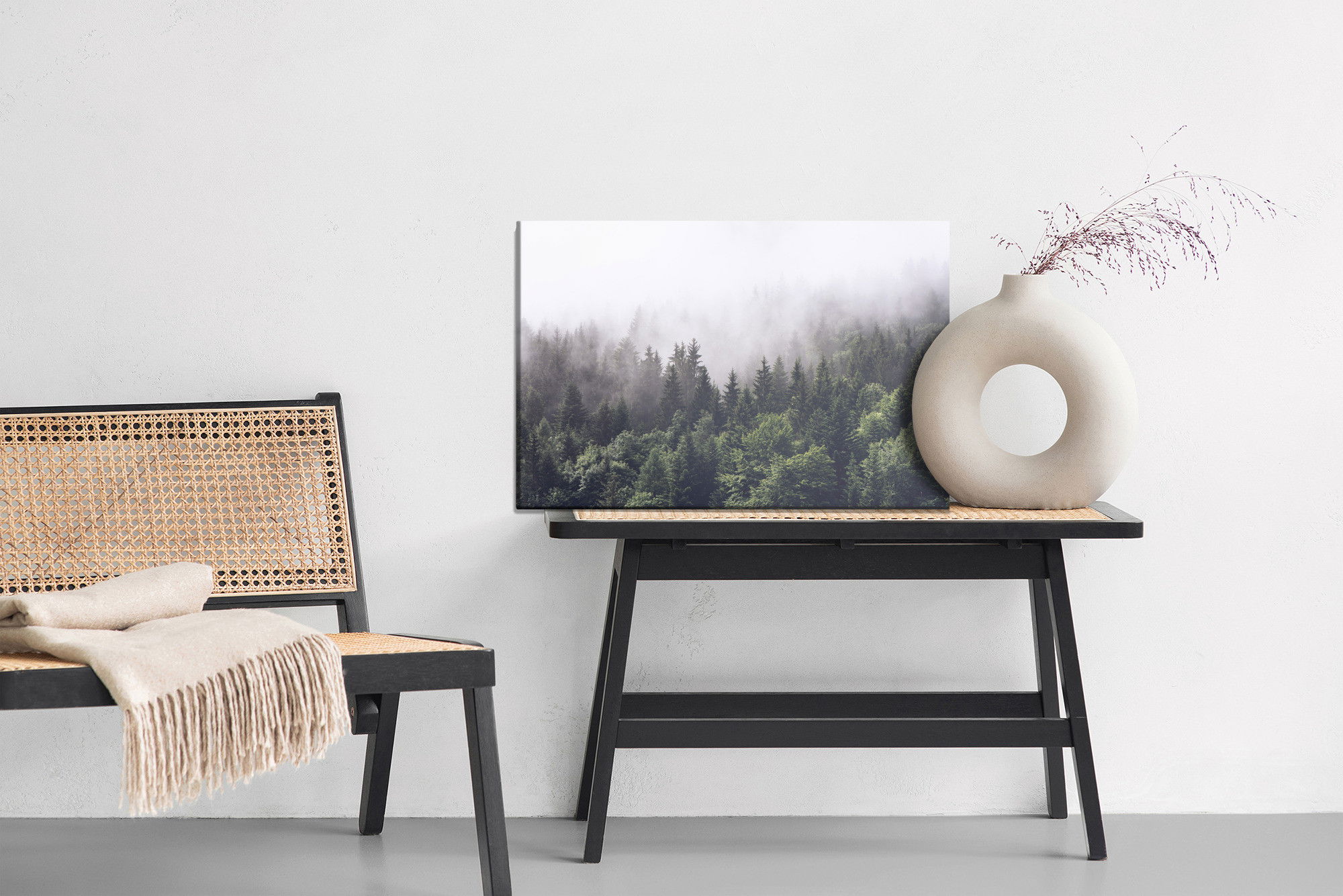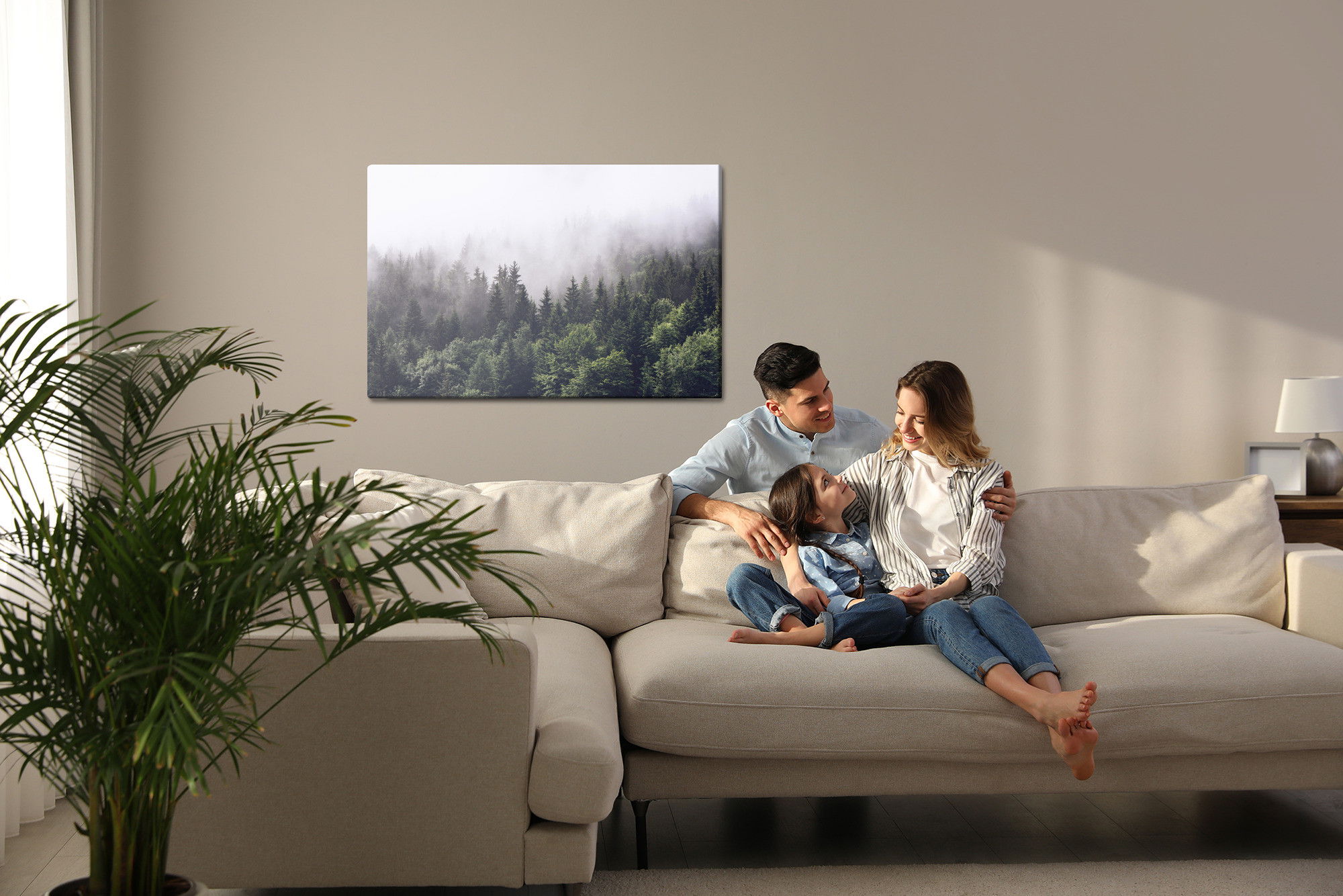 Varje tavla monteras på en massiv fururam. Format upp till 70×50 cm har en ram på 15 mm, medan format från 90×60 cm och uppåt har en ram på 20 mm. Den exakta dukspänningen gör att tavlan håller sin form över tid. Motivet Moon over misty trees trycks runt hela ramen vilket ger ett stilrent galleriuttryck där tavlan är lika vacker från sidan som framifrån. Kombinationen av rak dukspänning, rena linjer och korrekt tryck ger en professionell finish.