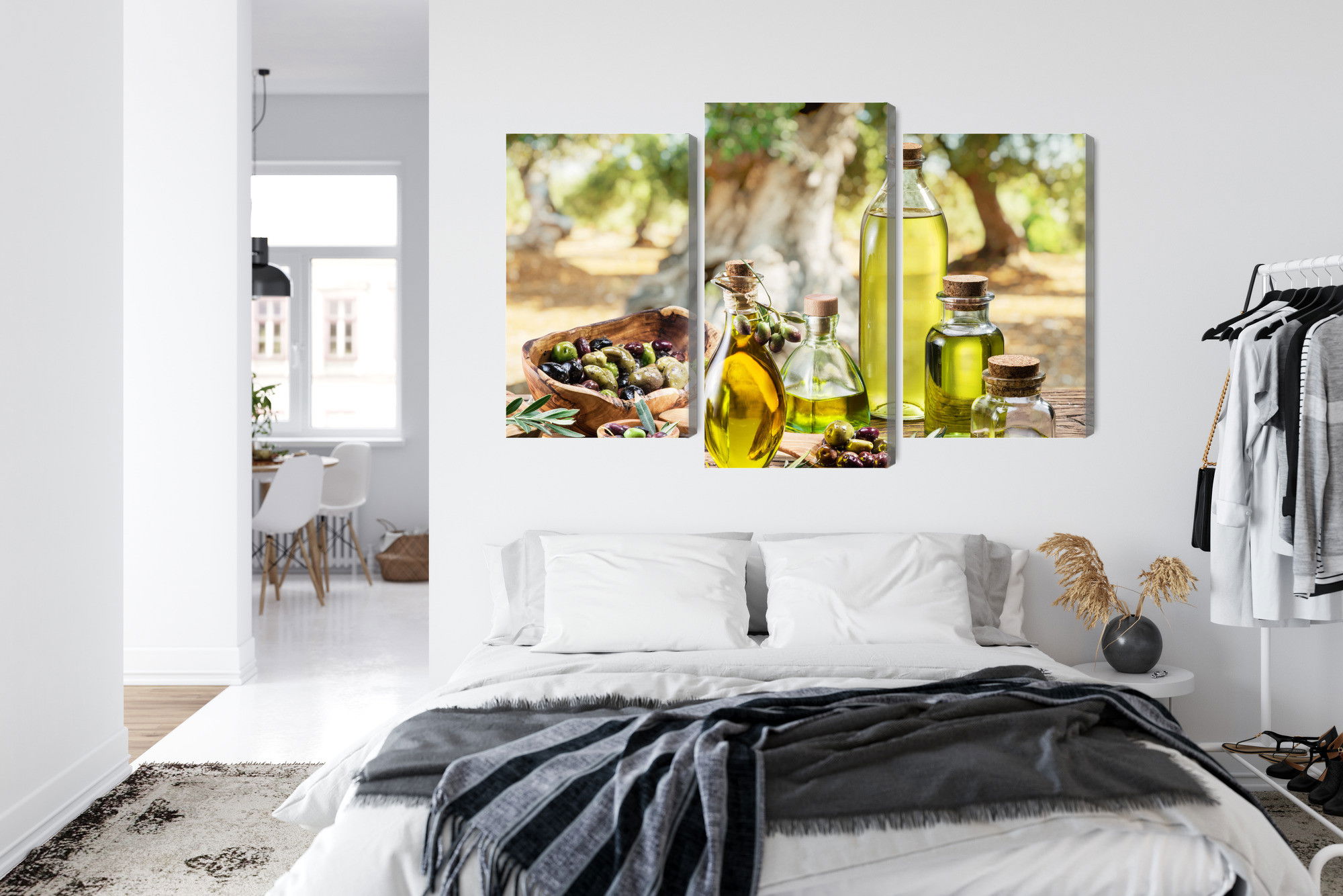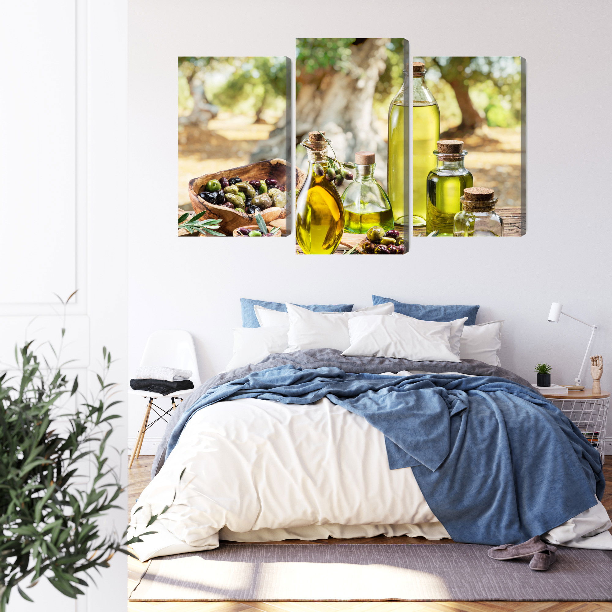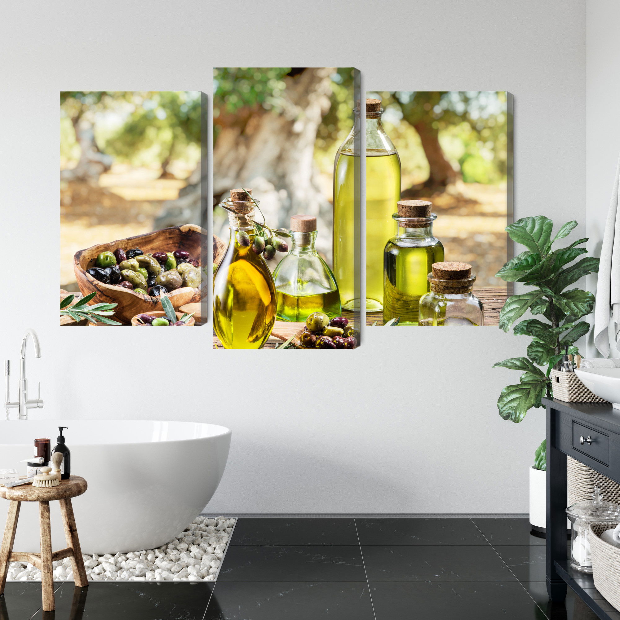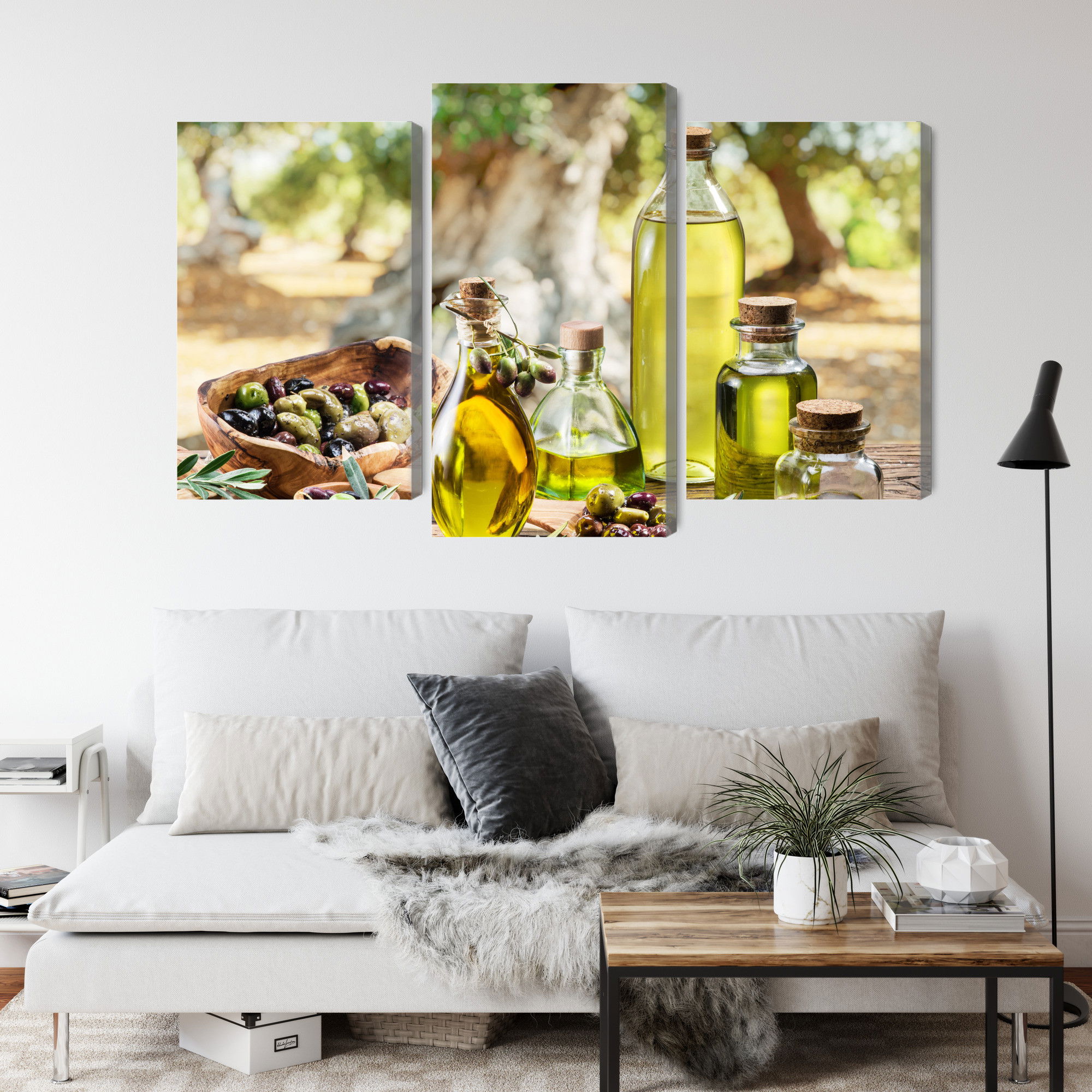 Varje tavla monteras på en massiv fururam. Format upp till 70×50 cm har en ram på 15 mm, medan format från 90×60 cm och uppåt har en ram på 20 mm. Den exakta dukspänningen gör att tavlan håller sin form över tid. Motivet Oil bottles trycks runt hela ramen vilket ger ett stilrent galleriuttryck där tavlan är lika vacker från sidan som framifrån. Kombinationen av rak dukspänning, rena linjer och korrekt tryck ger en professionell finish.