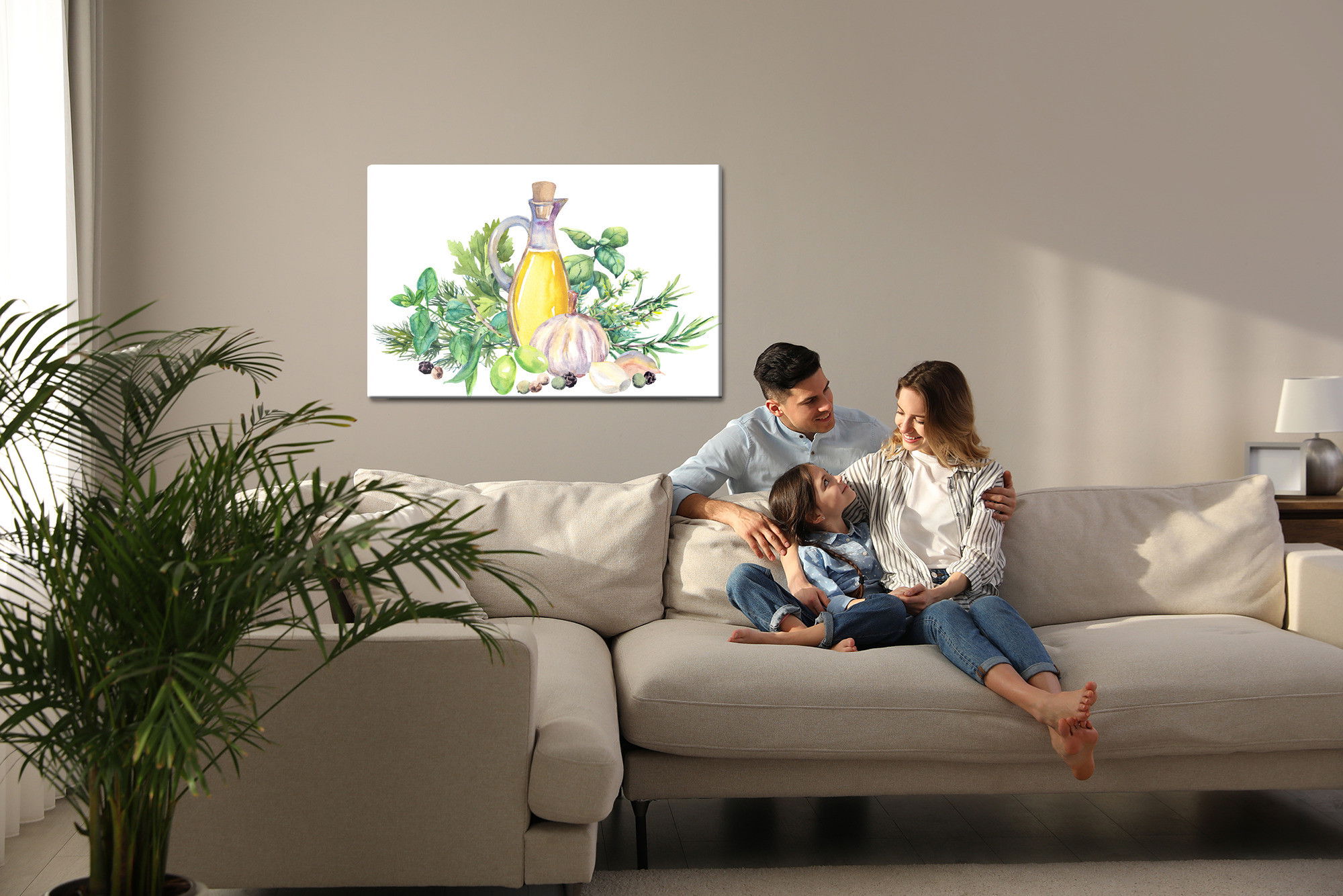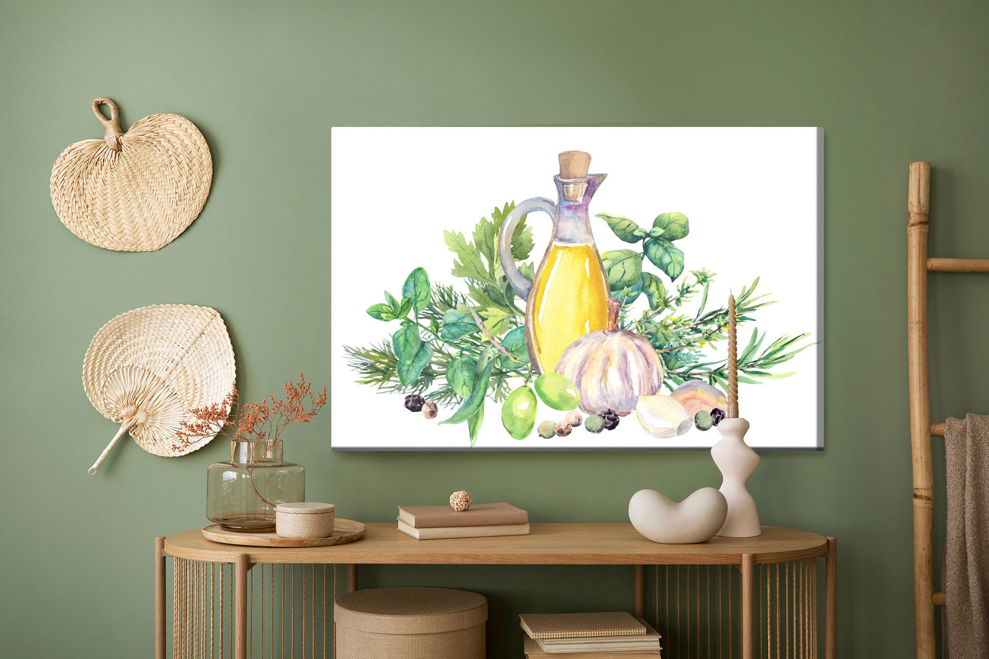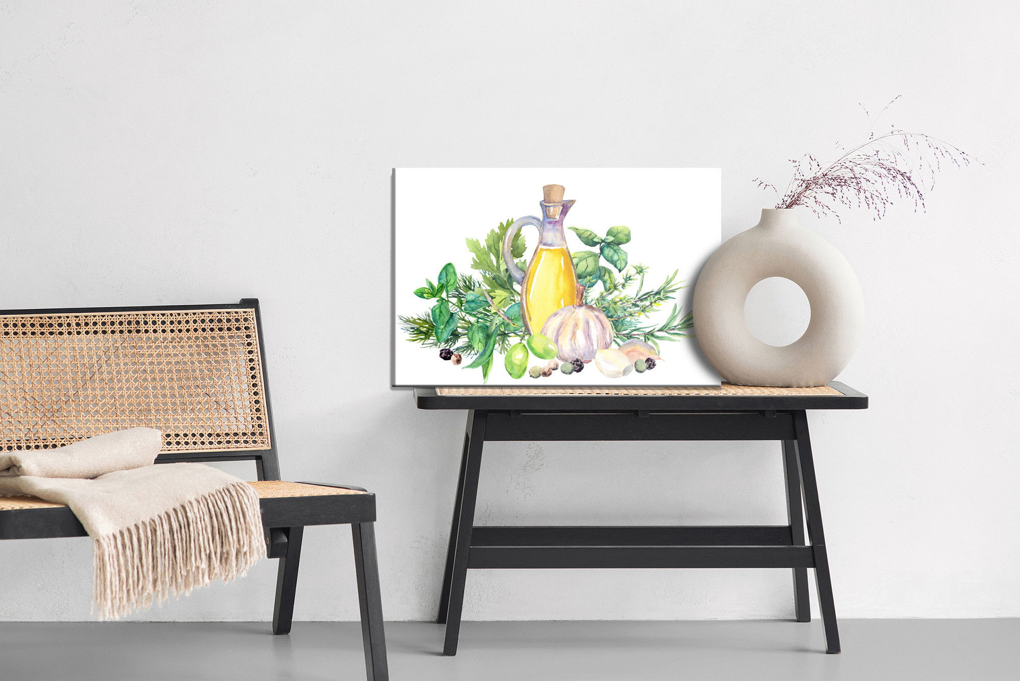 Motivet Oil with herbs and spices återges med hög färgprecision och detaljrikedom tack vare HP Latex-teknologi. Trycket sker med vattenbaserade, luktfria och GREENGUARD Gold-certifierade bläck som ger en upplösning på upp till 300 DPI. Färgerna är UV-beständiga och behåller sin styrka även i ljusa rum, vilket gör tavlan lämplig för både hem- och offentliga miljöer.