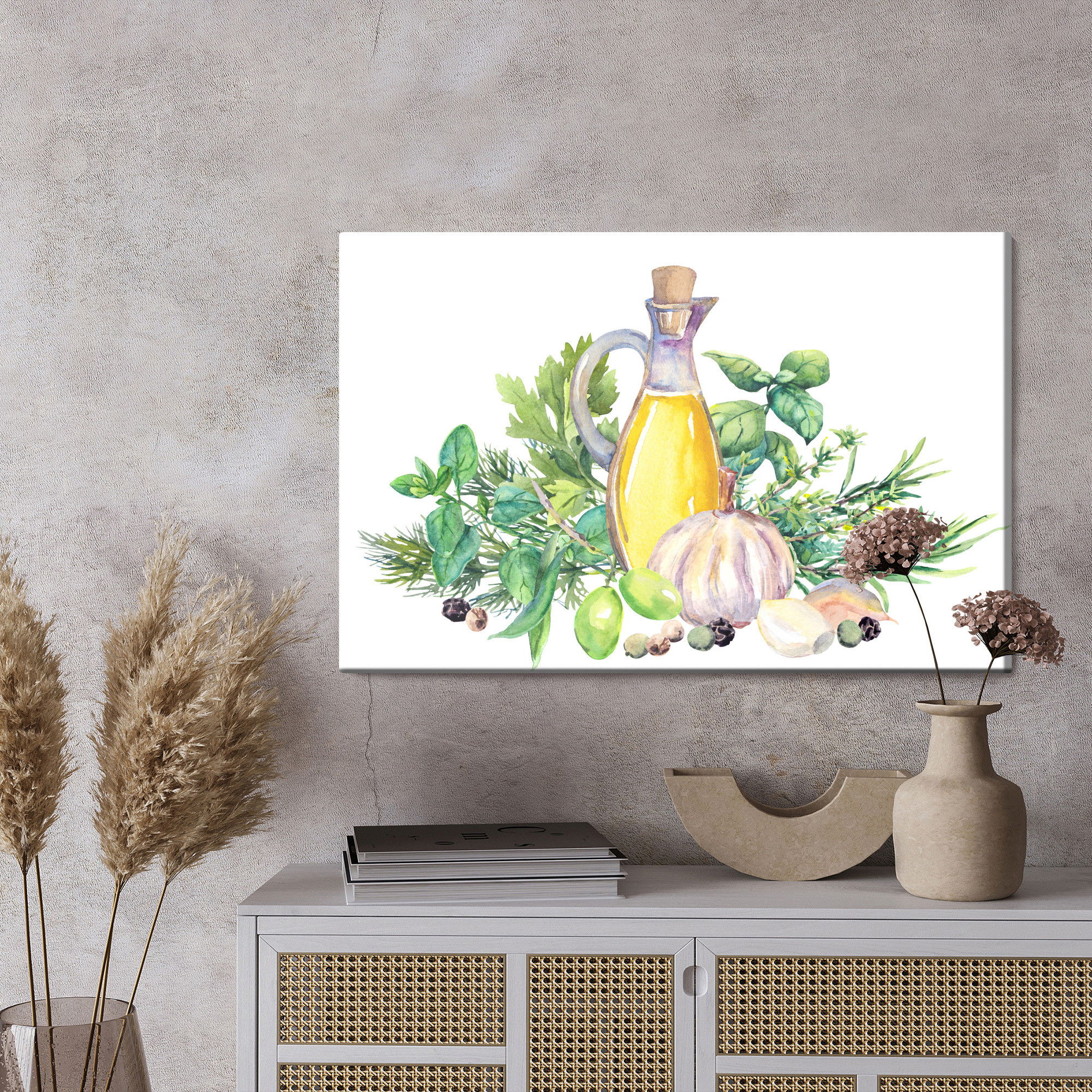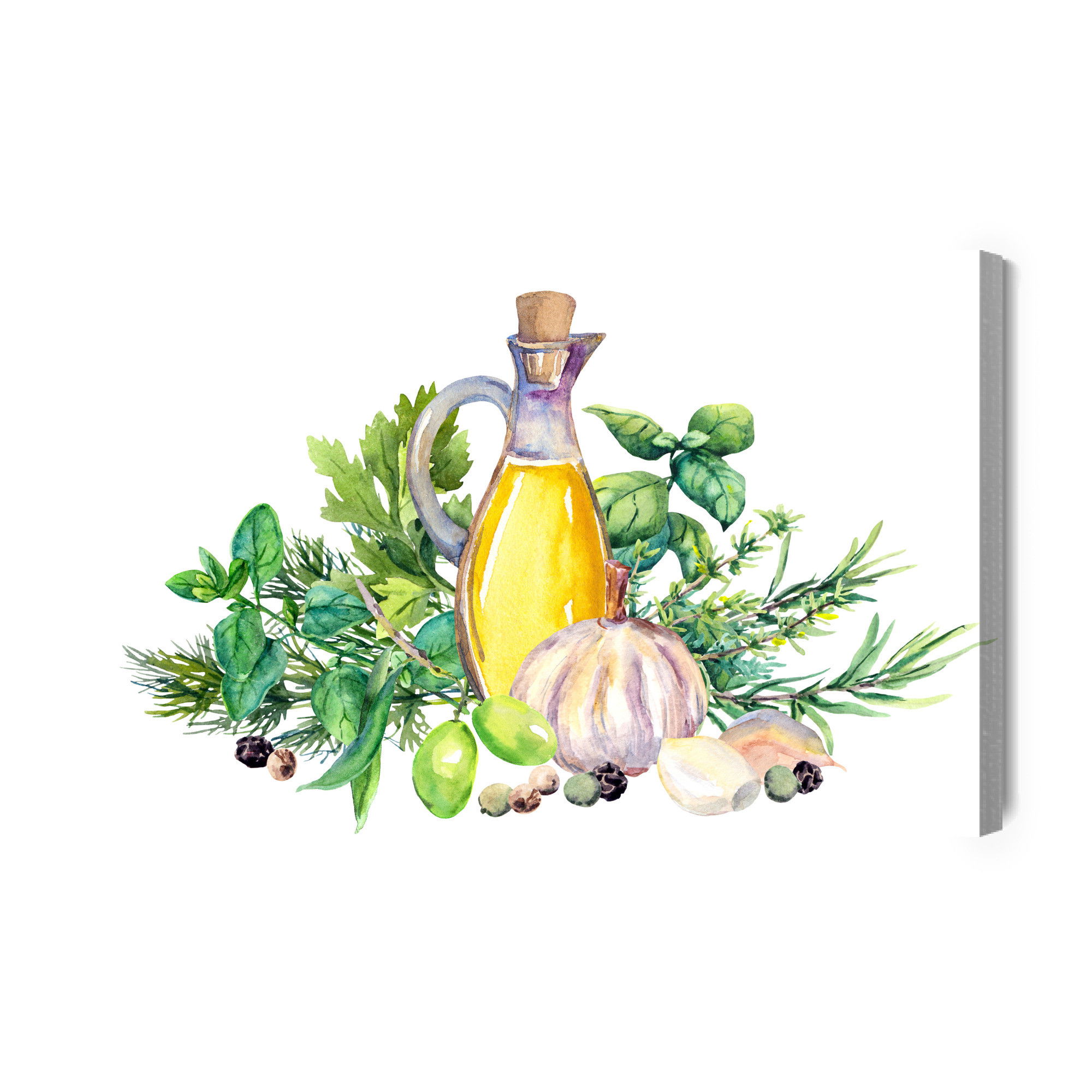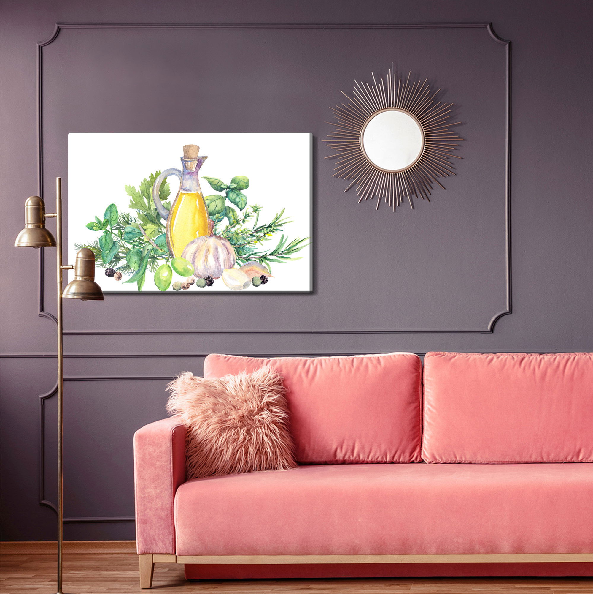 Motivet Oil with herbs and spices återges med hög färgprecision och detaljrikedom tack vare HP Latex-teknologi. Trycket sker med vattenbaserade, luktfria och GREENGUARD Gold-certifierade bläck som ger en upplösning på upp till 300 DPI. Färgerna är UV-beständiga och behåller sin styrka även i ljusa rum, vilket gör tavlan lämplig för både hem- och offentliga miljöer.