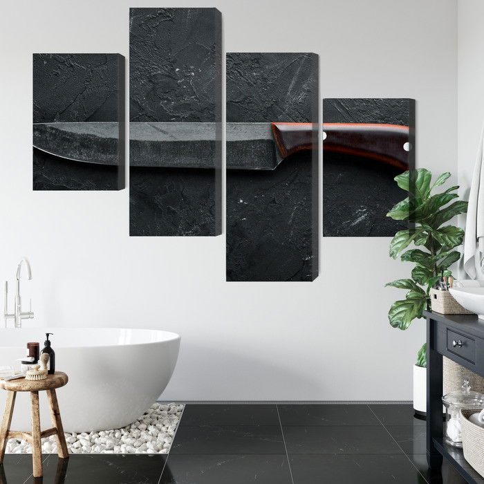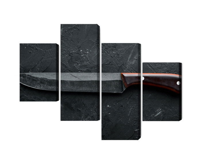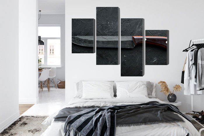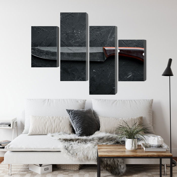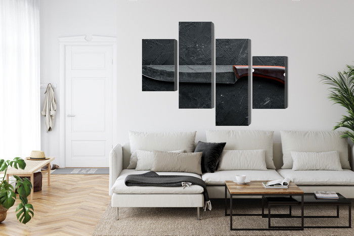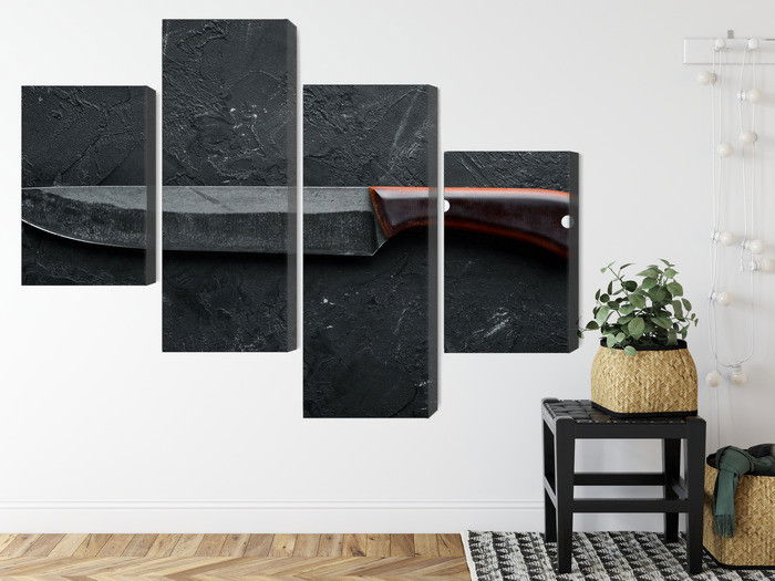 SilentDirects ljuddämpande tavla Old kitchen knife kombinerar ett högupplöst motiv med avancerad akustikteknik. Varje tavla monteras i Sverige och bygger på en stabil canvastavla med fururam, där insidan av ramen fylls med en ljudabsorberande kärna av återvunnen polyester. Konstruktionen gör tavlan till ett både estetiskt och funktionellt inslag i rummet.