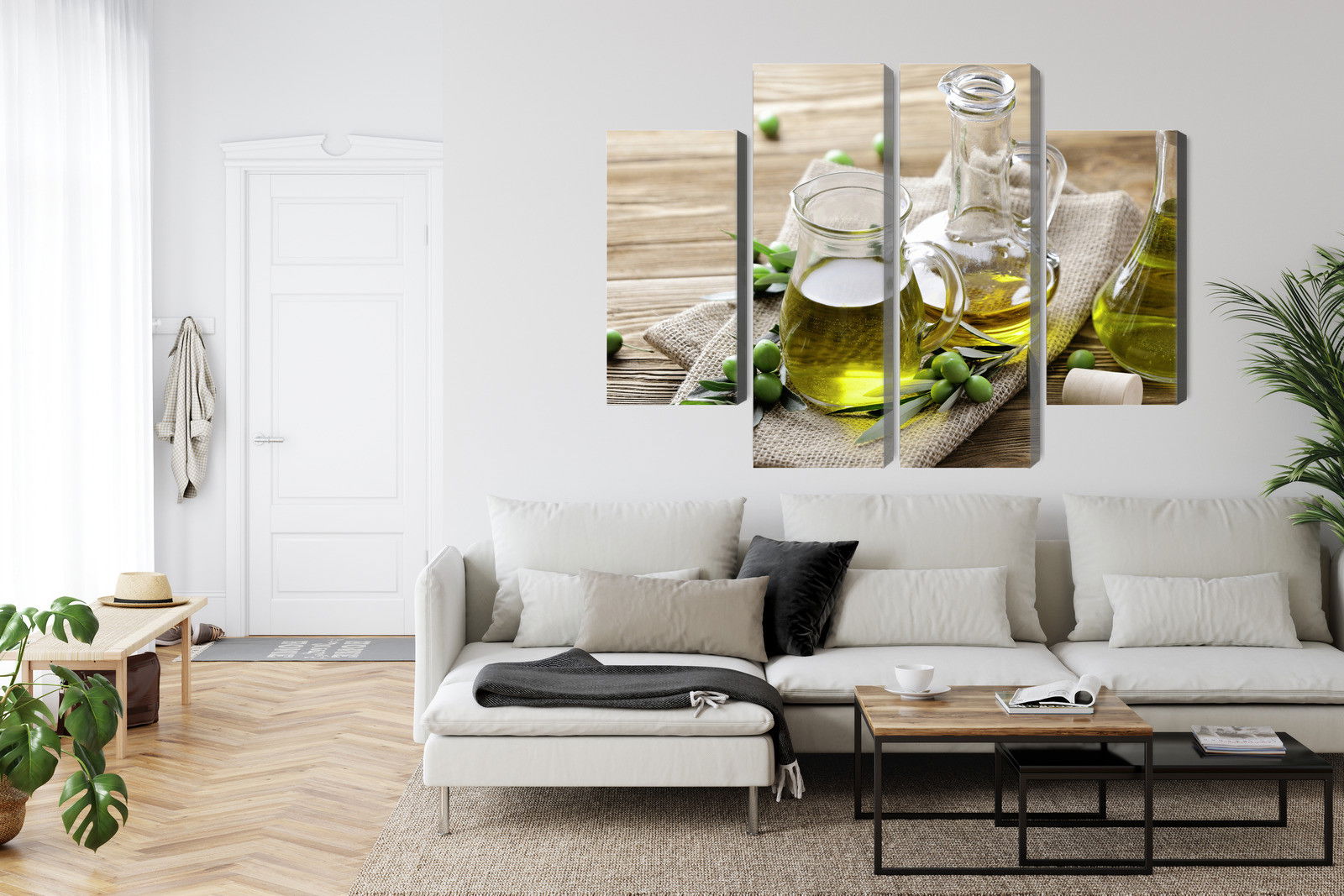 Motivet Olive oil with green olives återges med hög färgprecision och detaljrikedom tack vare HP Latex-teknologi. Trycket sker med vattenbaserade, luktfria och GREENGUARD Gold-certifierade bläck som ger en upplösning på upp till 300 DPI. Färgerna är UV-beständiga och behåller sin styrka även i ljusa rum, vilket gör tavlan lämplig för både hem- och offentliga miljöer.