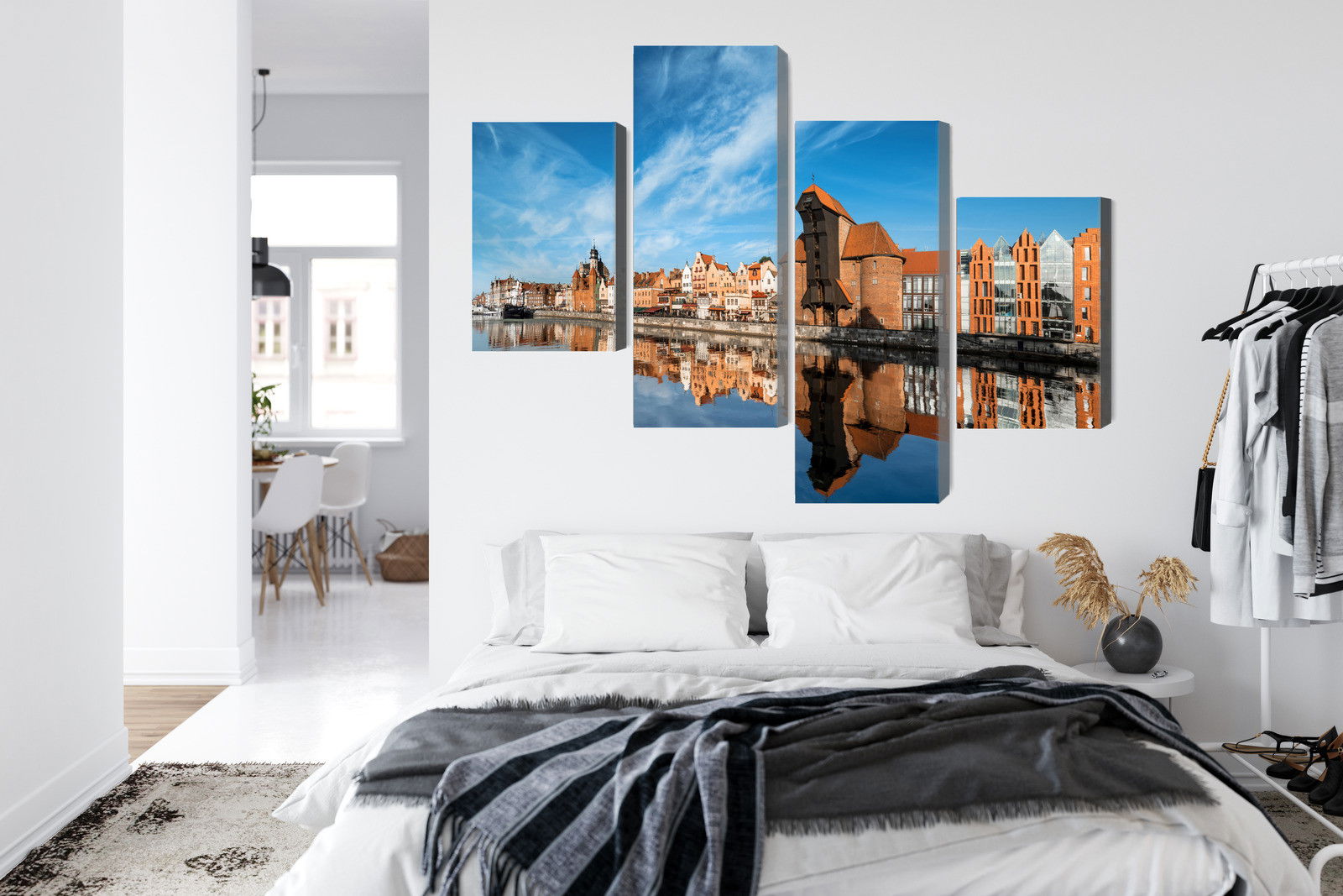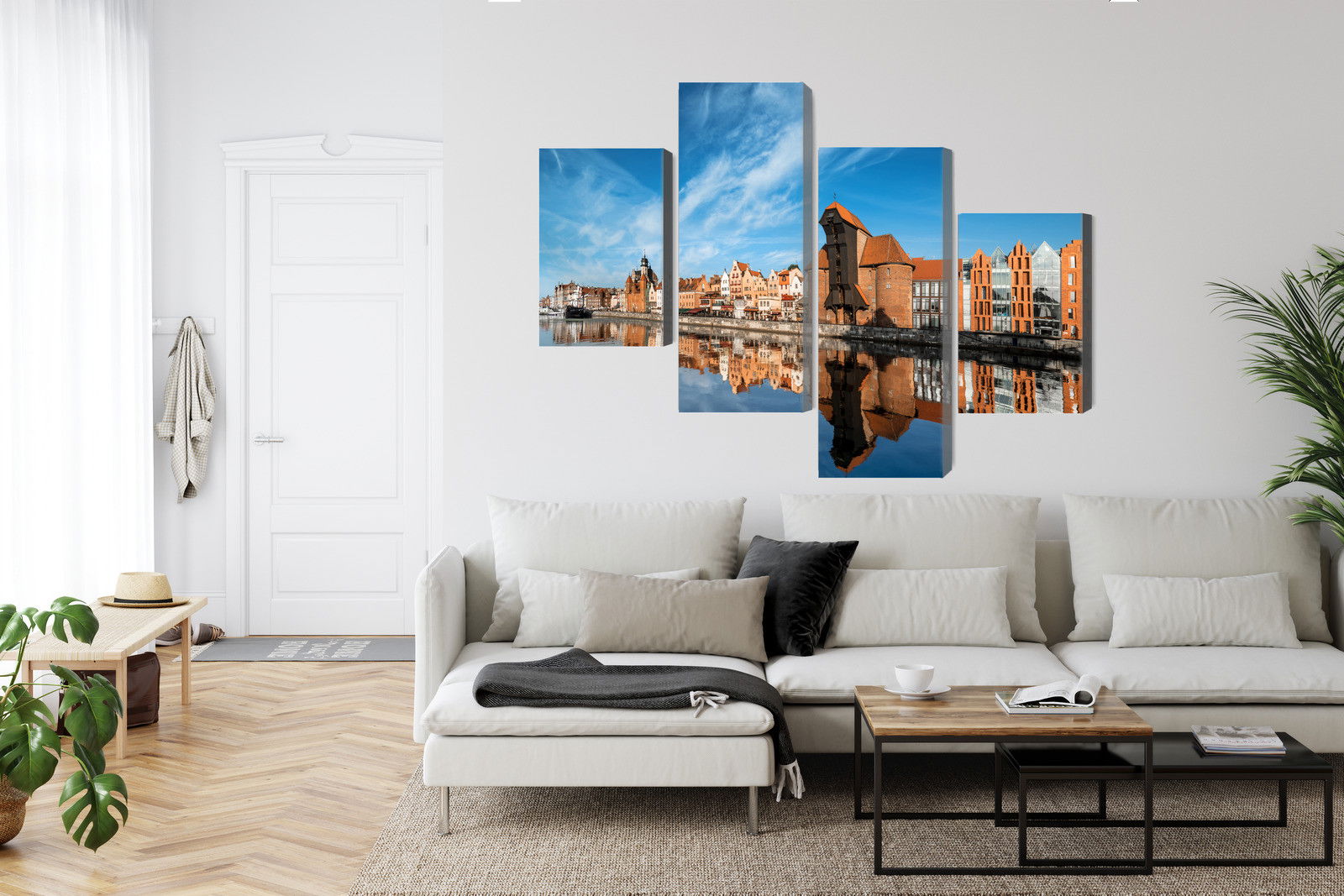 SilentDirects ljuddämpande tavla Panorama of gdansk kombinerar ett högupplöst motiv med avancerad akustikteknik. Varje tavla monteras i Sverige och bygger på en stabil canvastavla med fururam, där insidan av ramen fylls med en ljudabsorberande kärna av återvunnen polyester. Konstruktionen gör tavlan till ett både estetiskt och funktionellt inslag i rummet.