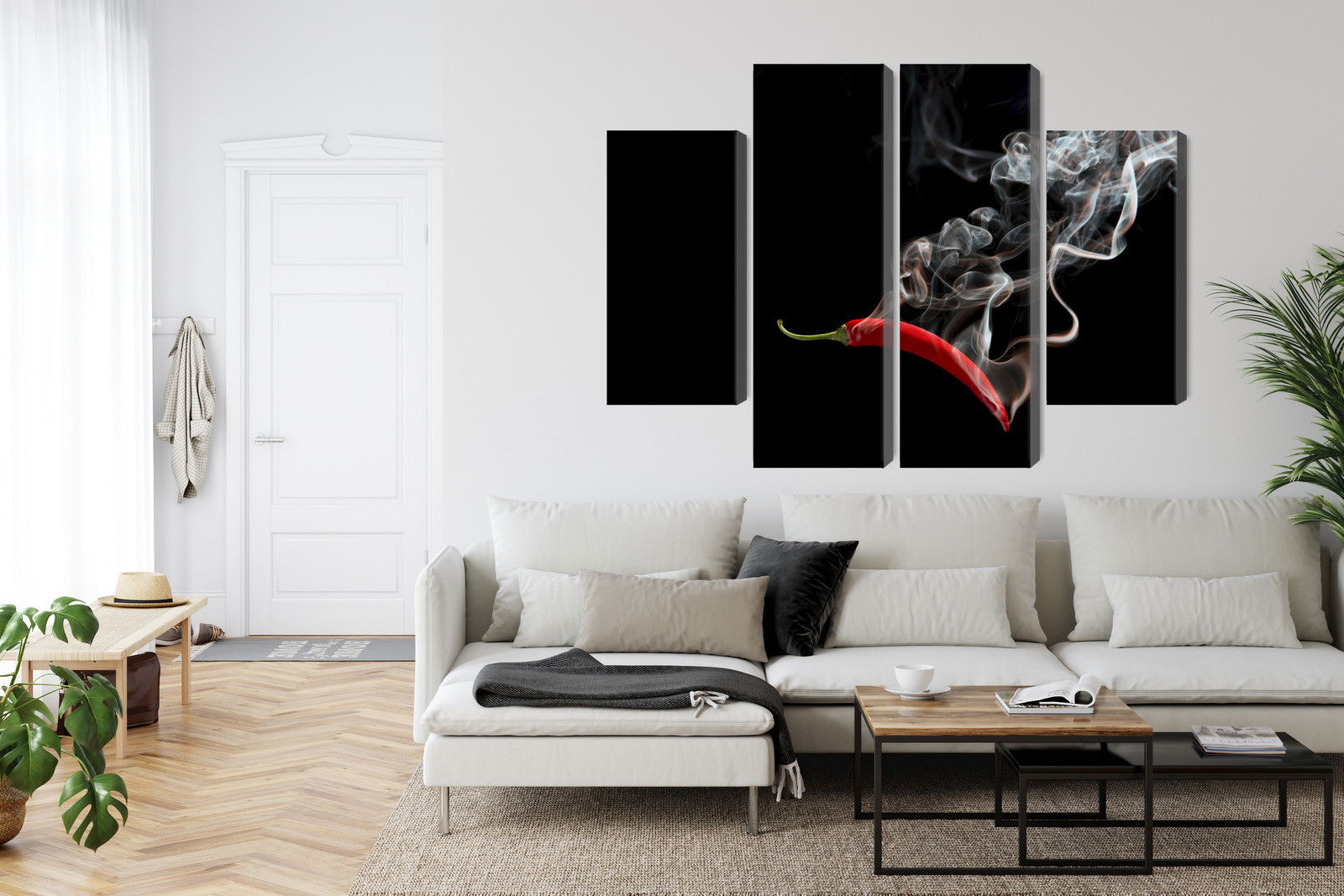 SilentDirects ljuddämpande tavla Red chili with smoke kombinerar ett högupplöst motiv med avancerad akustikteknik. Varje tavla monteras i Sverige och bygger på en stabil canvastavla med fururam, där insidan av ramen fylls med en ljudabsorberande kärna av återvunnen polyester. Konstruktionen gör tavlan till ett både estetiskt och funktionellt inslag i rummet.