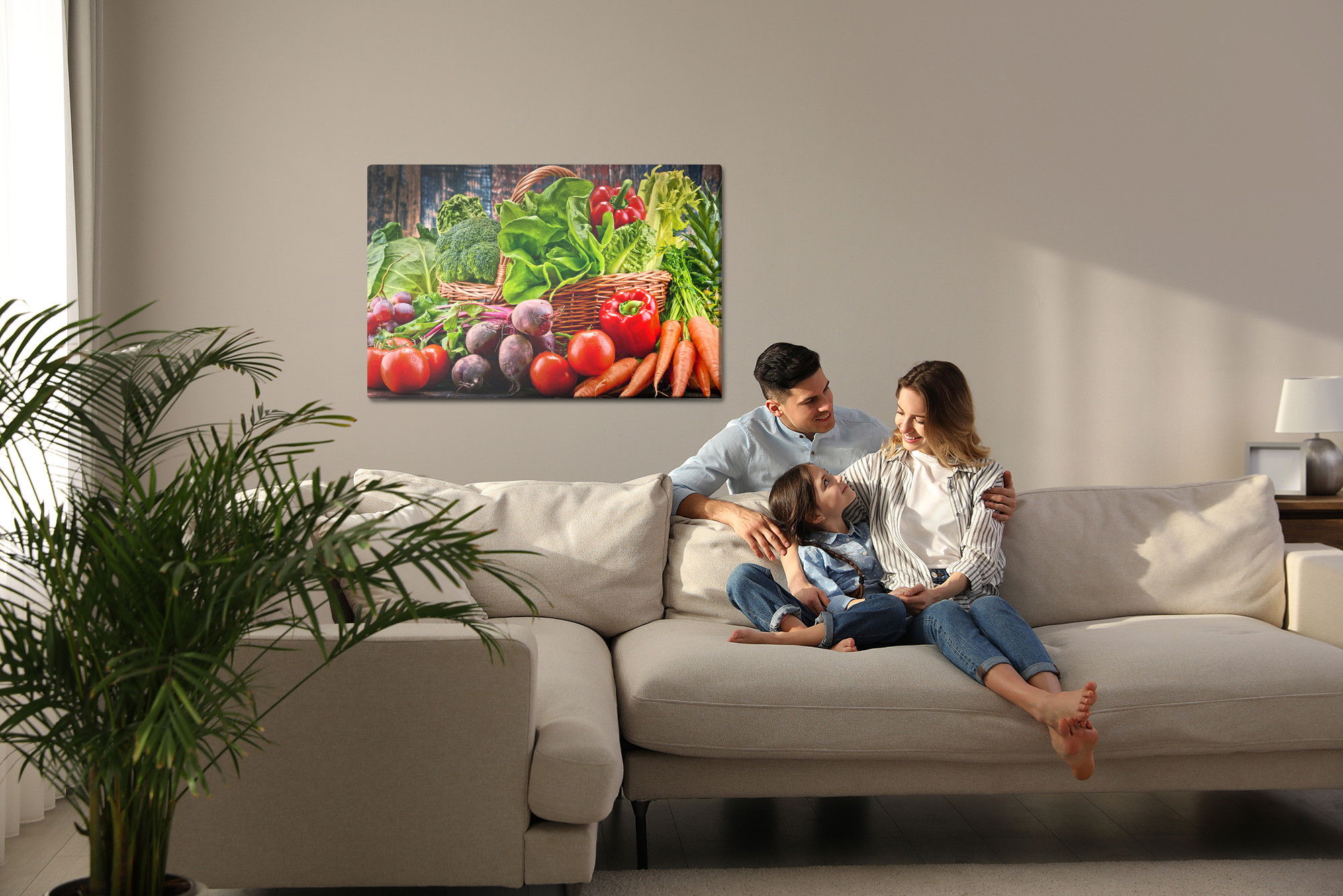 Varje tavla monteras på en massiv fururam. Format upp till 70×50 cm har en ram på 15 mm, medan format från 90×60 cm och uppåt har en ram på 20 mm. Den exakta dukspänningen gör att tavlan håller sin form över tid. Motivet Rich basket of vegetables trycks runt hela ramen vilket ger ett stilrent galleriuttryck där tavlan är lika vacker från sidan som framifrån. Kombinationen av rak dukspänning, rena linjer och korrekt tryck ger en professionell finish.