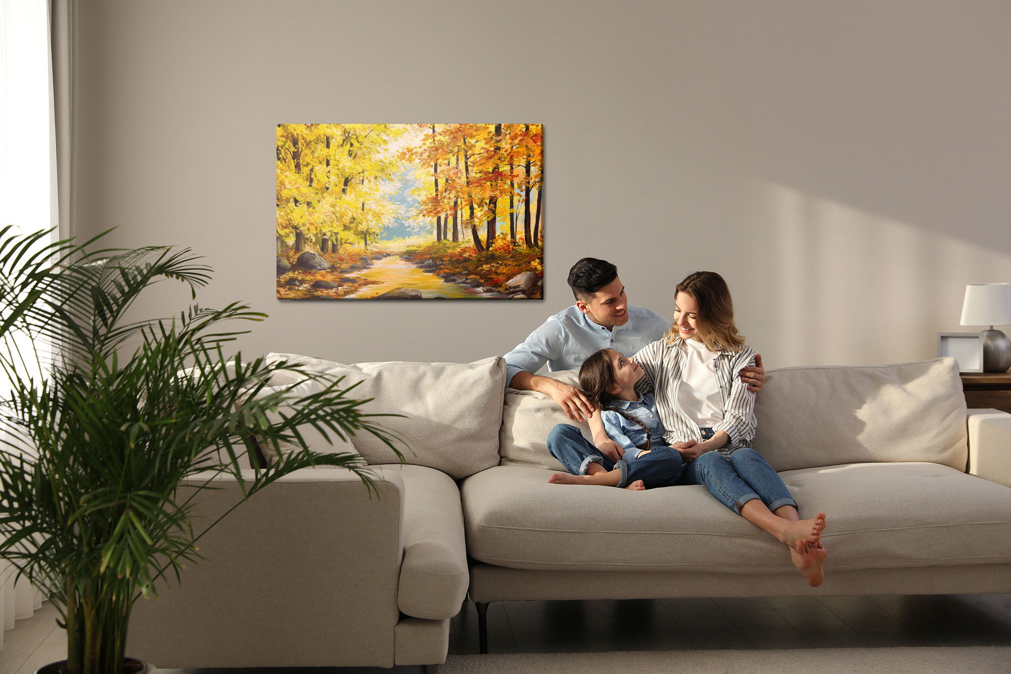 Varje tavla monteras på en massiv fururam. Format upp till 70×50 cm har en ram på 15 mm, medan format från 90×60 cm och uppåt har en ram på 20 mm. Den exakta dukspänningen gör att tavlan håller sin form över tid. Motivet Rocks in the autumn forest trycks runt hela ramen vilket ger ett stilrent galleriuttryck där tavlan är lika vacker från sidan som framifrån. Kombinationen av rak dukspänning, rena linjer och korrekt tryck ger en professionell finish.