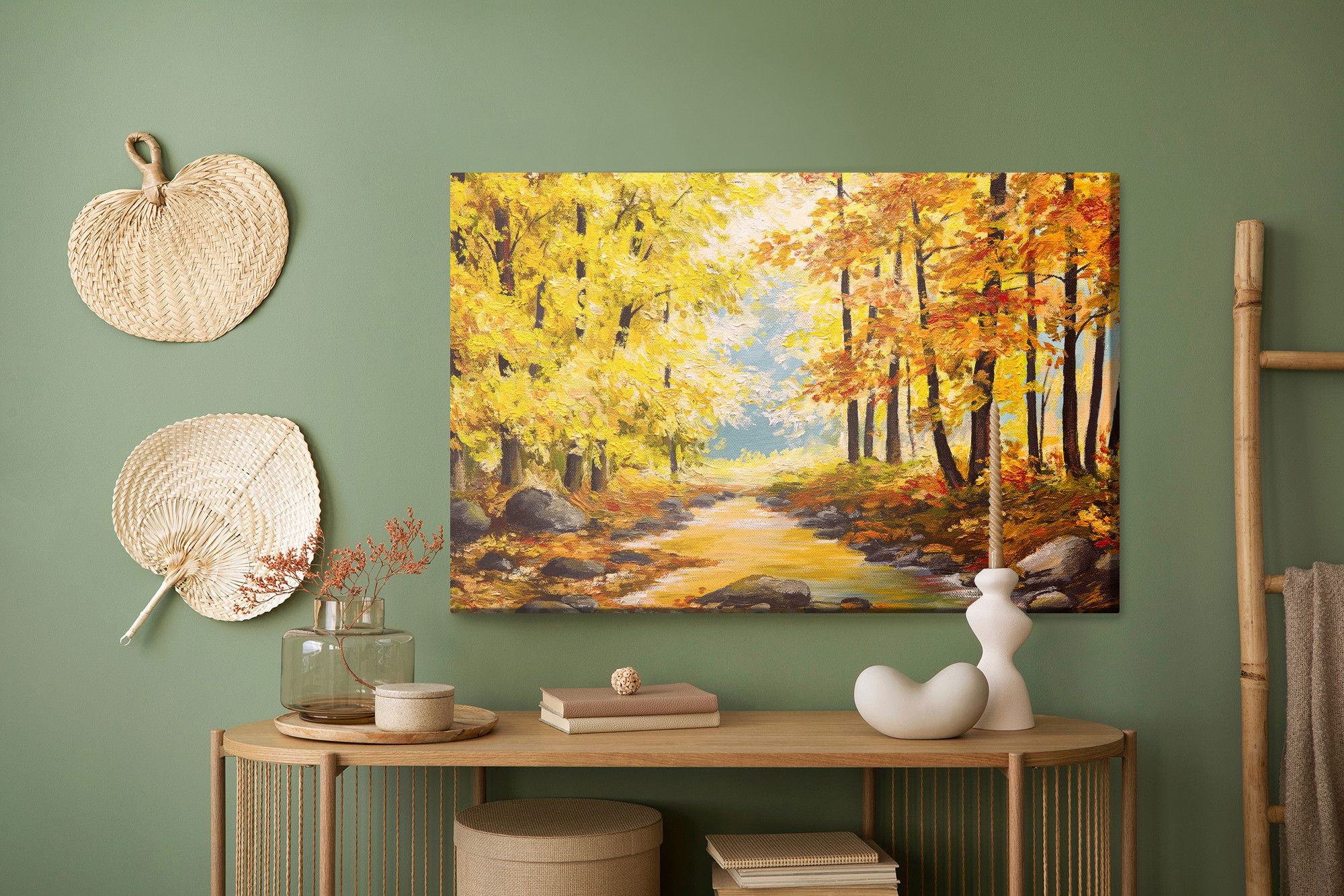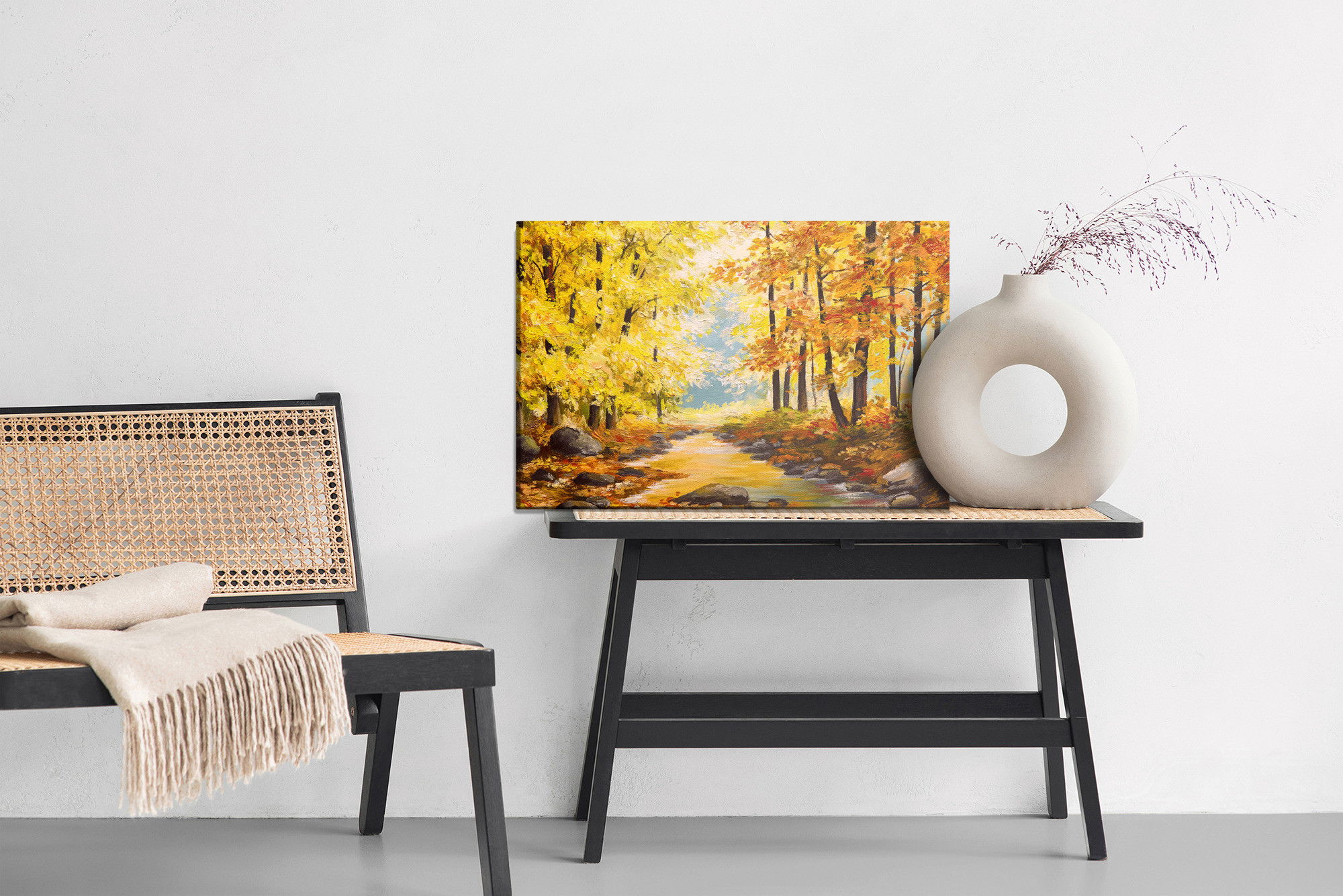 Motivet Rocks in the autumn forest återges med hög färgprecision och detaljrikedom tack vare HP Latex-teknologi. Trycket sker med vattenbaserade, luktfria och GREENGUARD Gold-certifierade bläck som ger en upplösning på upp till 300 DPI. Färgerna är UV-beständiga och behåller sin styrka även i ljusa rum, vilket gör tavlan lämplig för både hem- och offentliga miljöer.