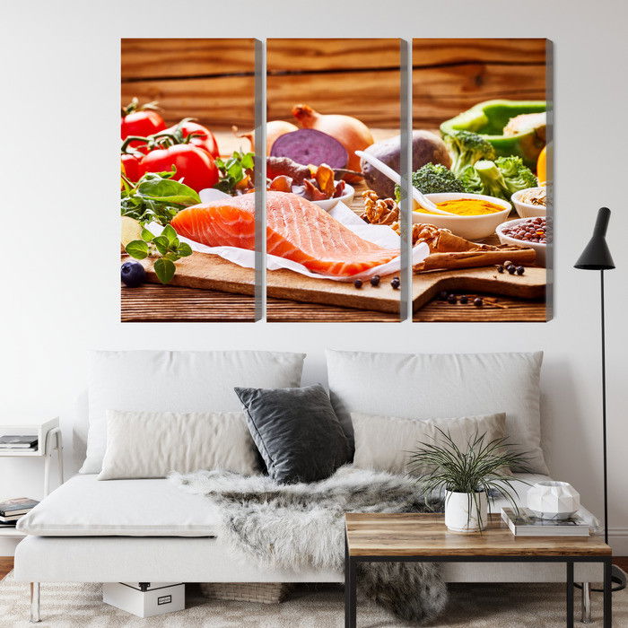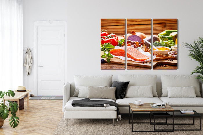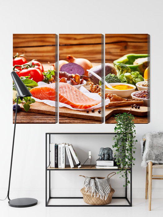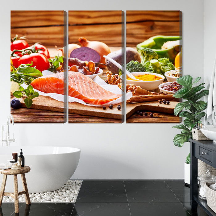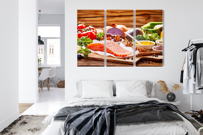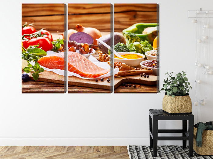 Motivet Salmon among vegetables återges med hög färgprecision och detaljrikedom tack vare HP Latex-teknologi. Trycket sker med vattenbaserade, luktfria och GREENGUARD Gold-certifierade bläck som ger en upplösning på upp till 300 DPI. Färgerna är UV-beständiga och behåller sin styrka även i ljusa rum, vilket gör tavlan lämplig för både hem- och offentliga miljöer.