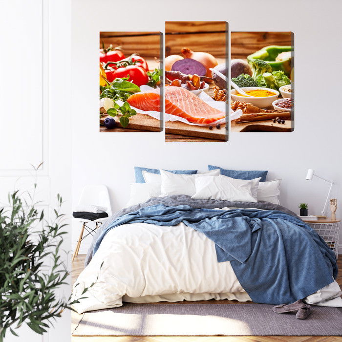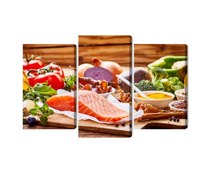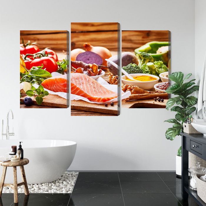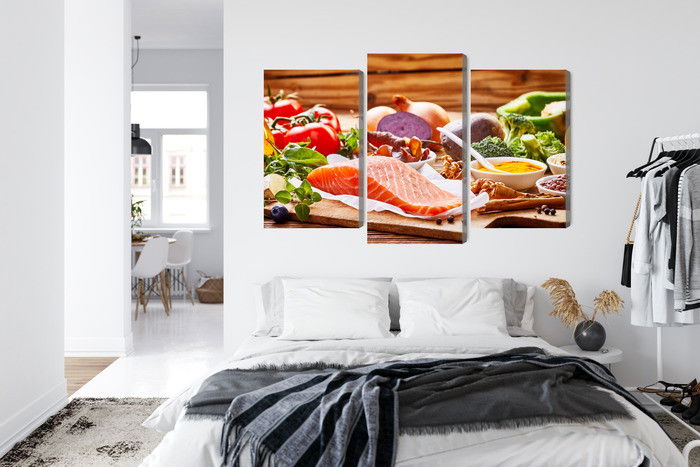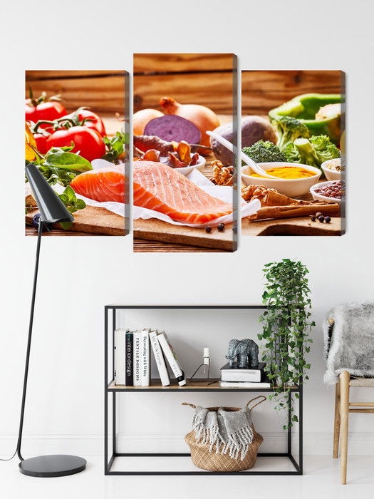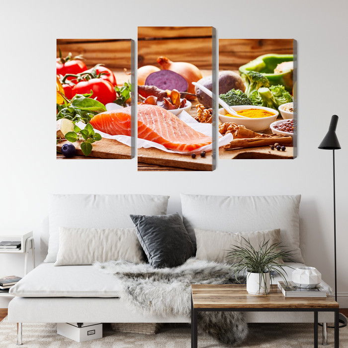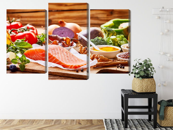 Motivet Salmon among vegetables återges med hög färgprecision och detaljrikedom tack vare HP Latex-teknologi. Trycket sker med vattenbaserade, luktfria och GREENGUARD Gold-certifierade bläck som ger en upplösning på upp till 300 DPI. Färgerna är UV-beständiga och behåller sin styrka även i ljusa rum, vilket gör tavlan lämplig för både hem- och offentliga miljöer.