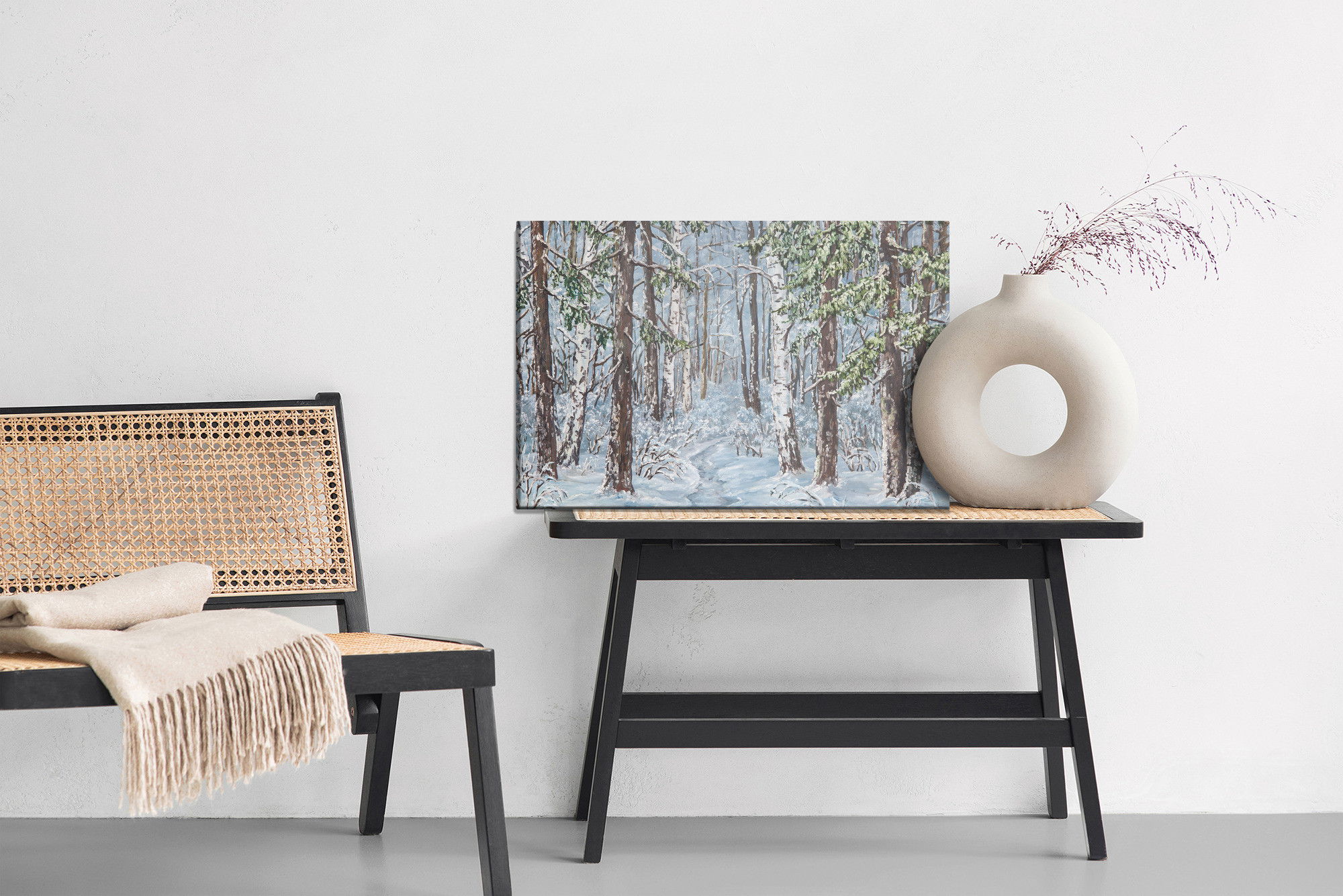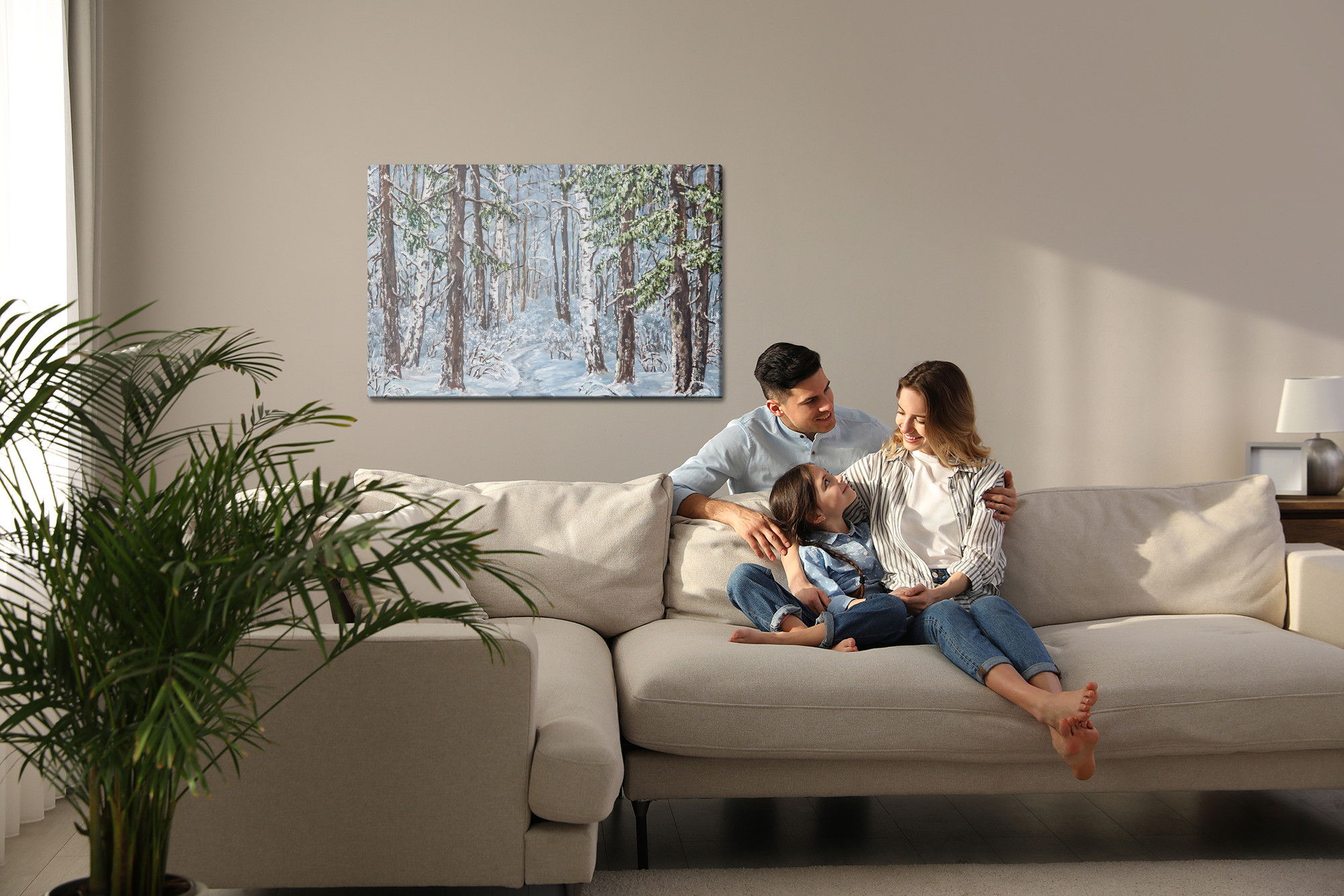 Varje tavla monteras på en massiv fururam. Format upp till 70×50 cm har en ram på 15 mm, medan format från 90×60 cm och uppåt har en ram på 20 mm. Den exakta dukspänningen gör att tavlan håller sin form över tid. Motivet Snow-covered forest trycks runt hela ramen vilket ger ett stilrent galleriuttryck där tavlan är lika vacker från sidan som framifrån. Kombinationen av rak dukspänning, rena linjer och korrekt tryck ger en professionell finish.