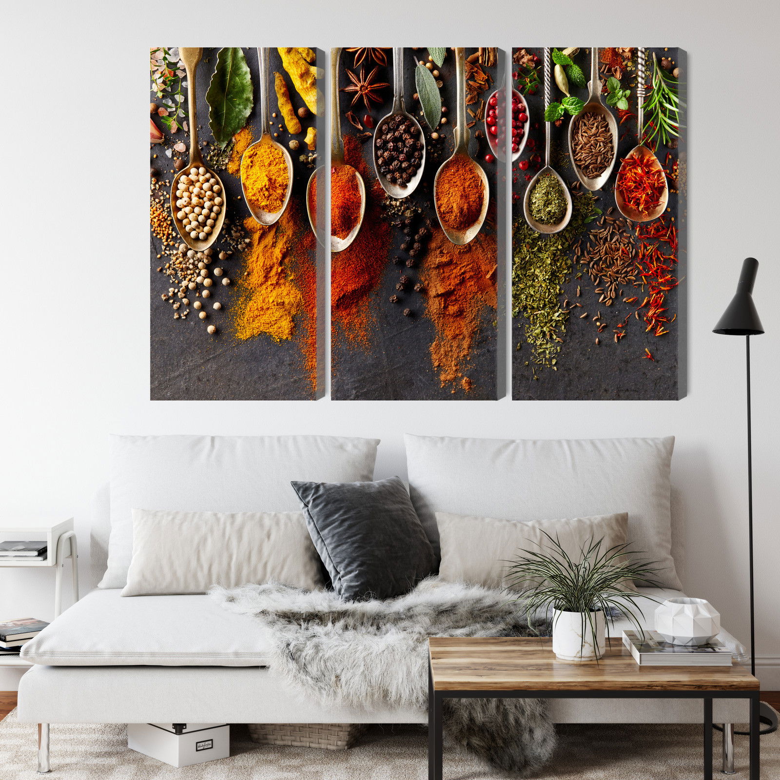 Varje tavla monteras på en massiv fururam. Format upp till 70×50 cm har en ram på 15 mm, medan format från 90×60 cm och uppåt har en ram på 20 mm. Den exakta dukspänningen gör att tavlan håller sin form över tid. Motivet Spices on a black background trycks runt hela ramen vilket ger ett stilrent galleriuttryck där tavlan är lika vacker från sidan som framifrån. Kombinationen av rak dukspänning, rena linjer och korrekt tryck ger en professionell finish.