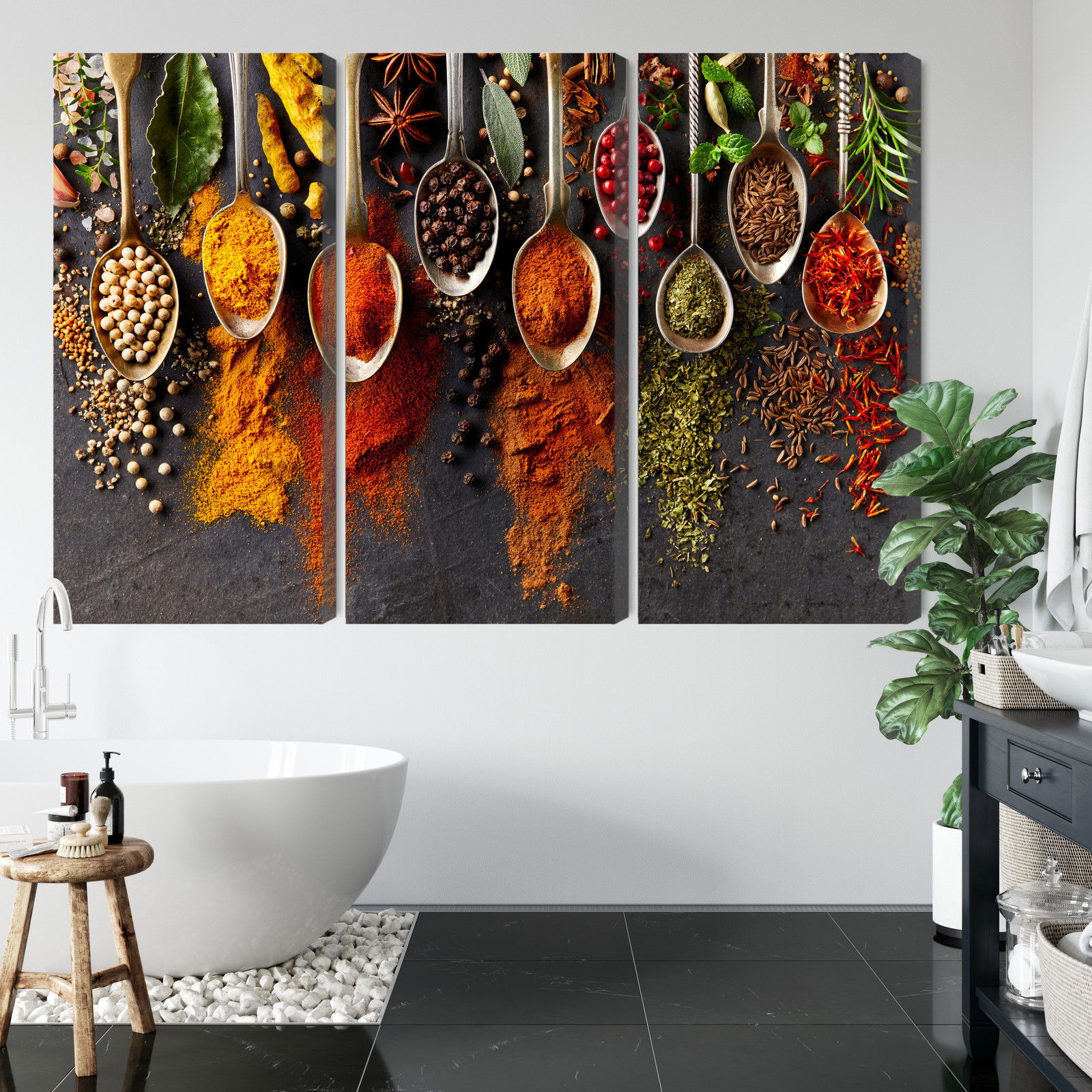 Motivet Spices on a black background återges med hög färgprecision och detaljrikedom tack vare HP Latex-teknologi. Trycket sker med vattenbaserade, luktfria och GREENGUARD Gold-certifierade bläck som ger en upplösning på upp till 300 DPI. Färgerna är UV-beständiga och behåller sin styrka även i ljusa rum, vilket gör tavlan lämplig för både hem- och offentliga miljöer.