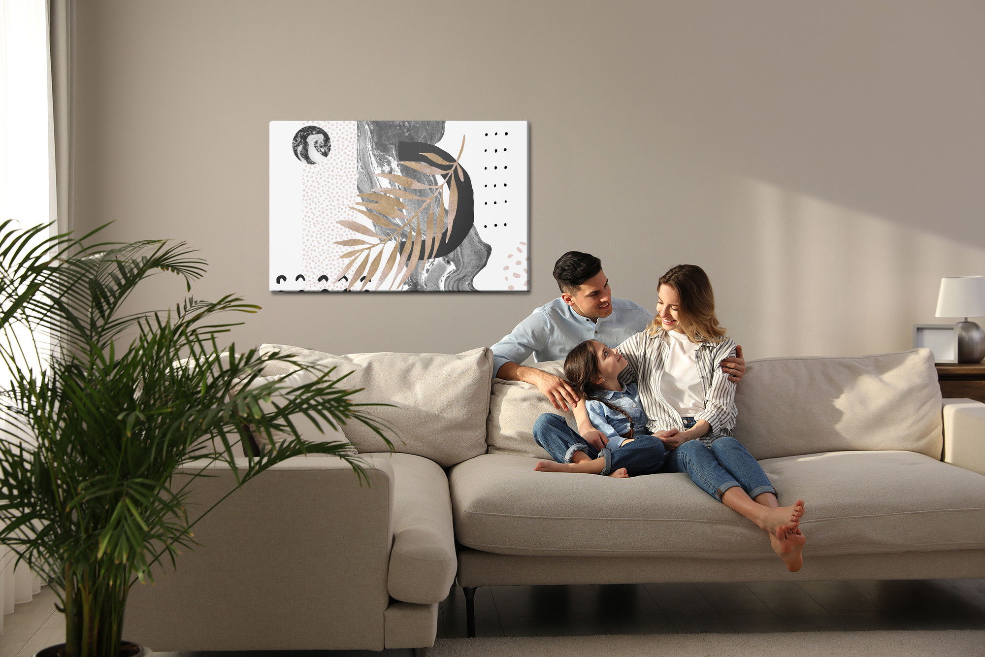 Varje tavla monteras på en massiv fururam. Format upp till 70×50 cm har en ram på 15 mm, medan format från 90×60 cm och uppåt har en ram på 20 mm. Den exakta dukspänningen gör att tavlan håller sin form över tid. Motivet Stylish abstraction trycks runt hela ramen vilket ger ett stilrent galleriuttryck där tavlan är lika vacker från sidan som framifrån. Kombinationen av rak dukspänning, rena linjer och korrekt tryck ger en professionell finish.