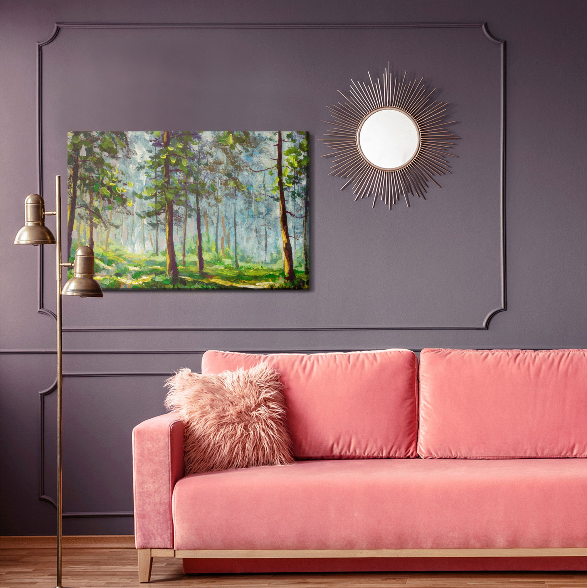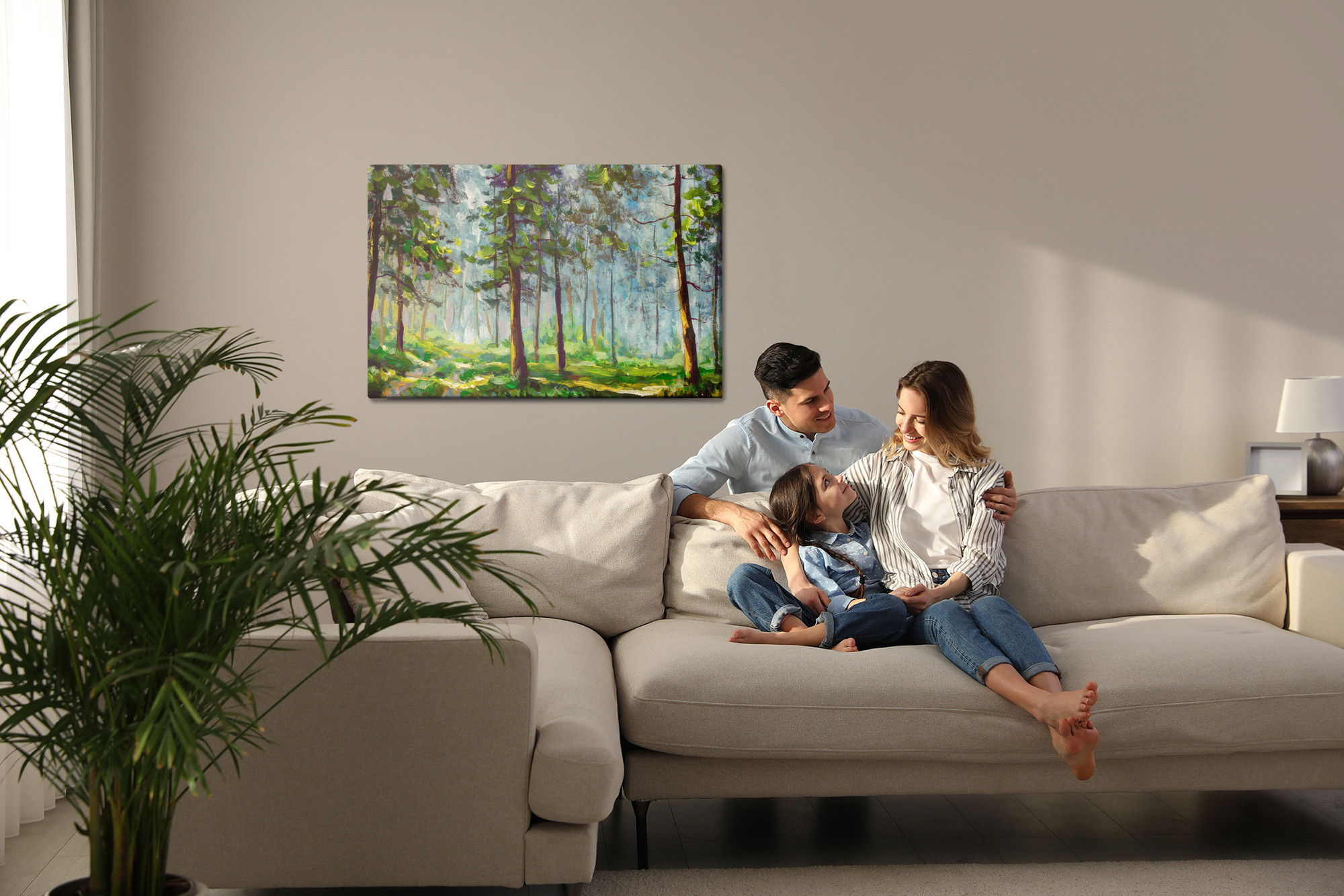 Motivet The forest landscape as if återges med hög färgprecision och detaljrikedom tack vare HP Latex-teknologi. Trycket sker med vattenbaserade, luktfria och GREENGUARD Gold-certifierade bläck som ger en upplösning på upp till 300 DPI. Färgerna är UV-beständiga och behåller sin styrka även i ljusa rum, vilket gör tavlan lämplig för både hem- och offentliga miljöer.