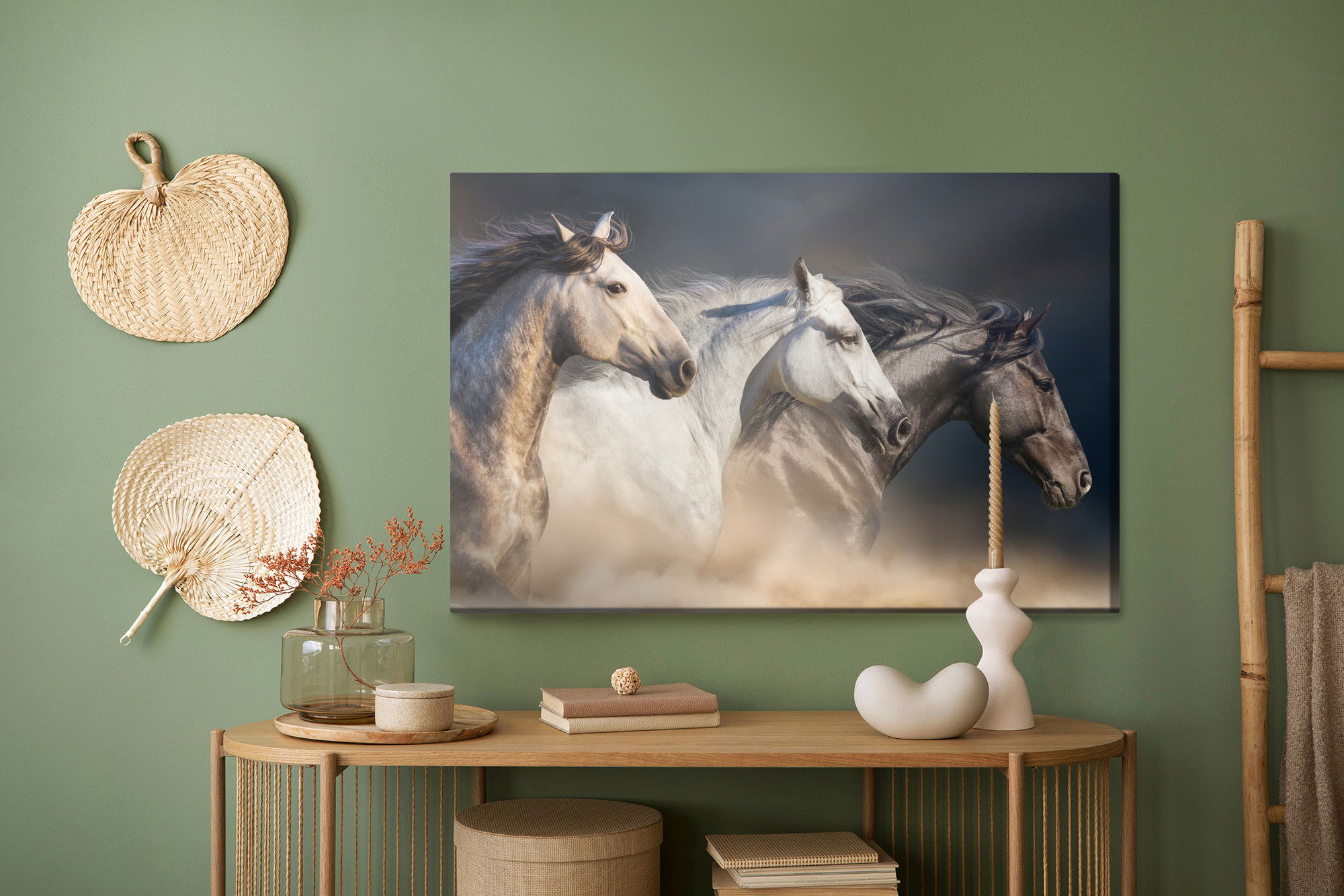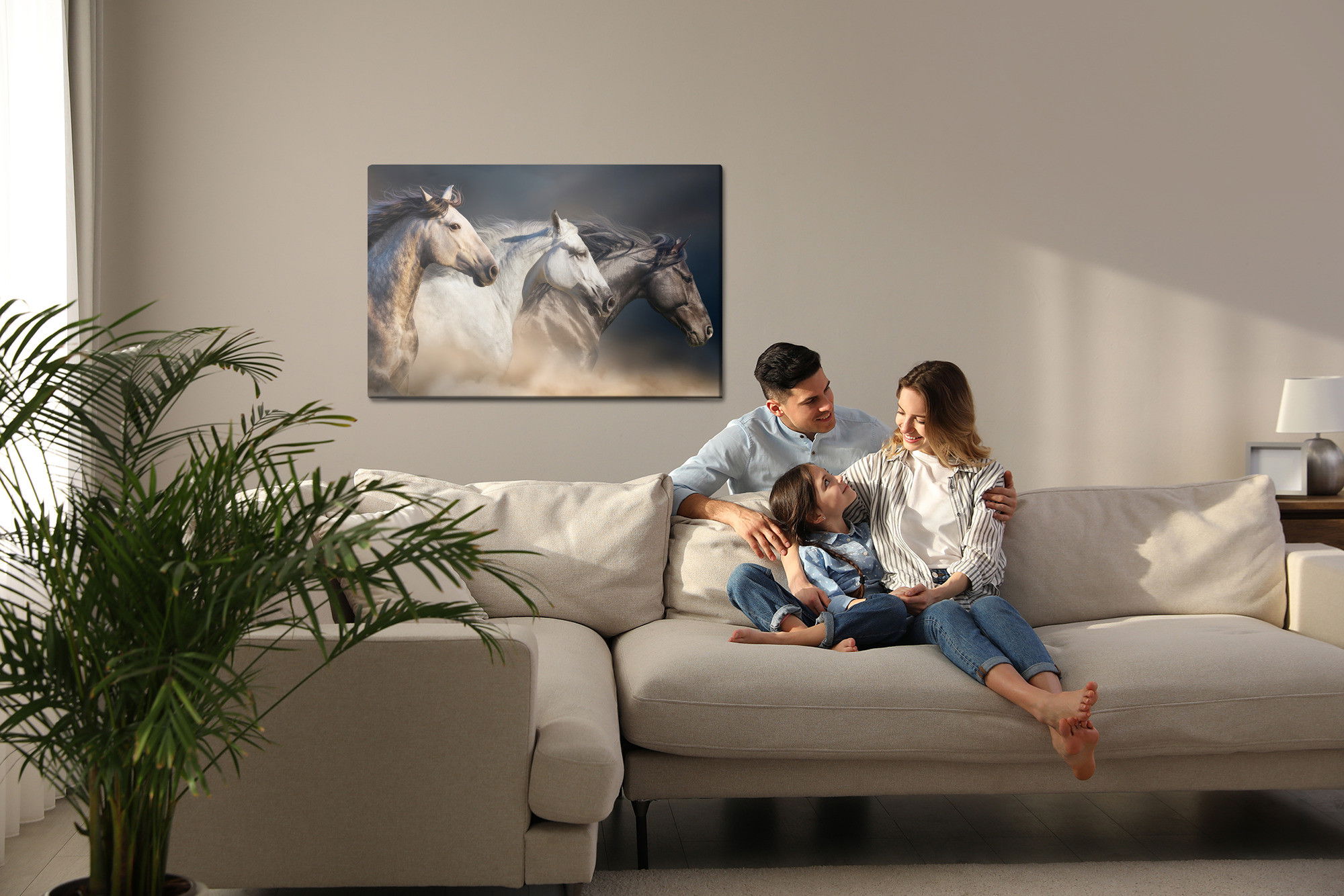 Motivet Three horses at a gallop återges med hög färgprecision och detaljrikedom tack vare HP Latex-teknologi. Trycket sker med vattenbaserade, luktfria och GREENGUARD Gold-certifierade bläck som ger en upplösning på upp till 300 DPI. Färgerna är UV-beständiga och behåller sin styrka även i ljusa rum, vilket gör tavlan lämplig för både hem- och offentliga miljöer.