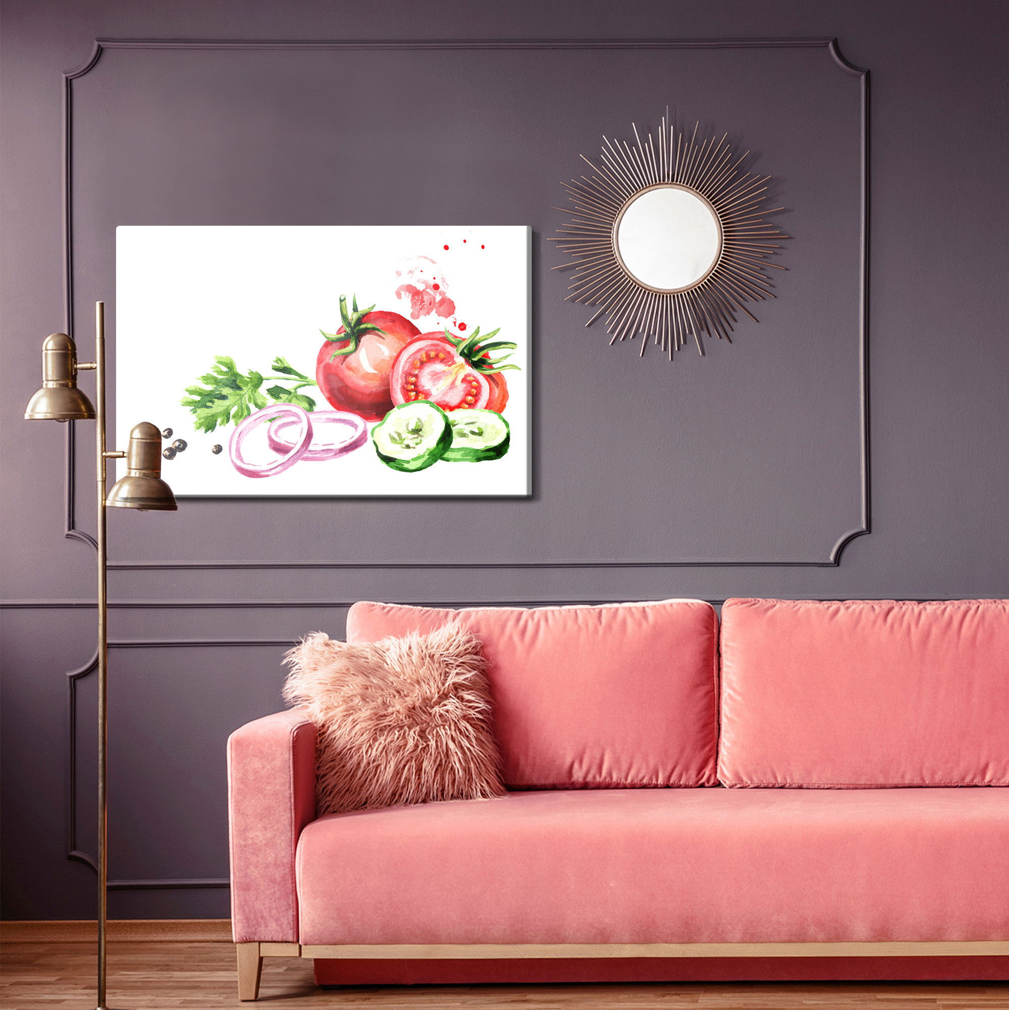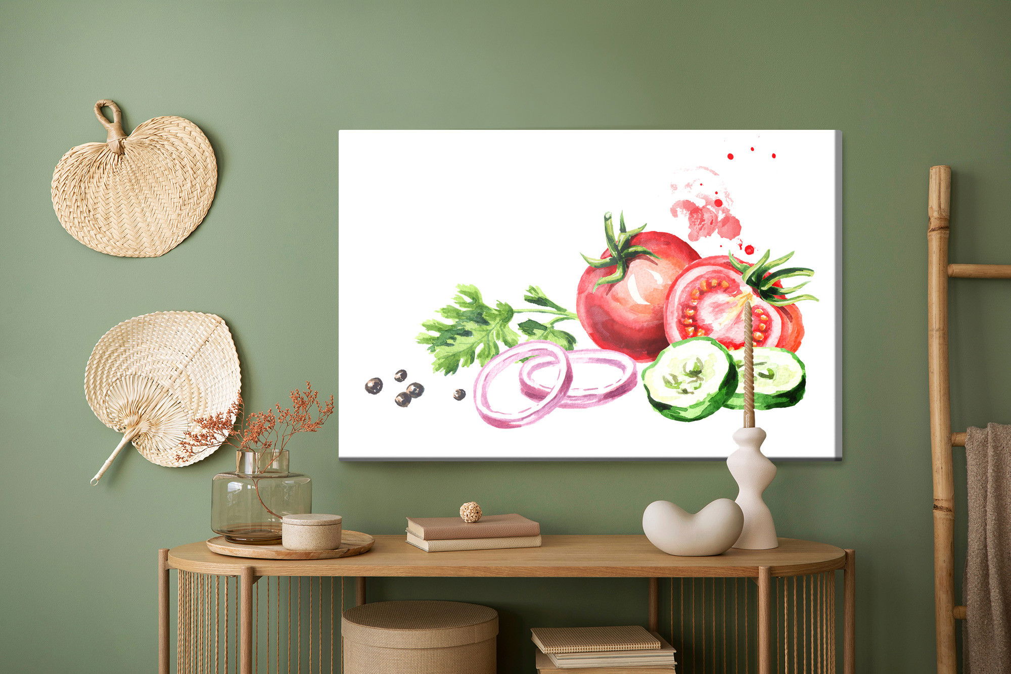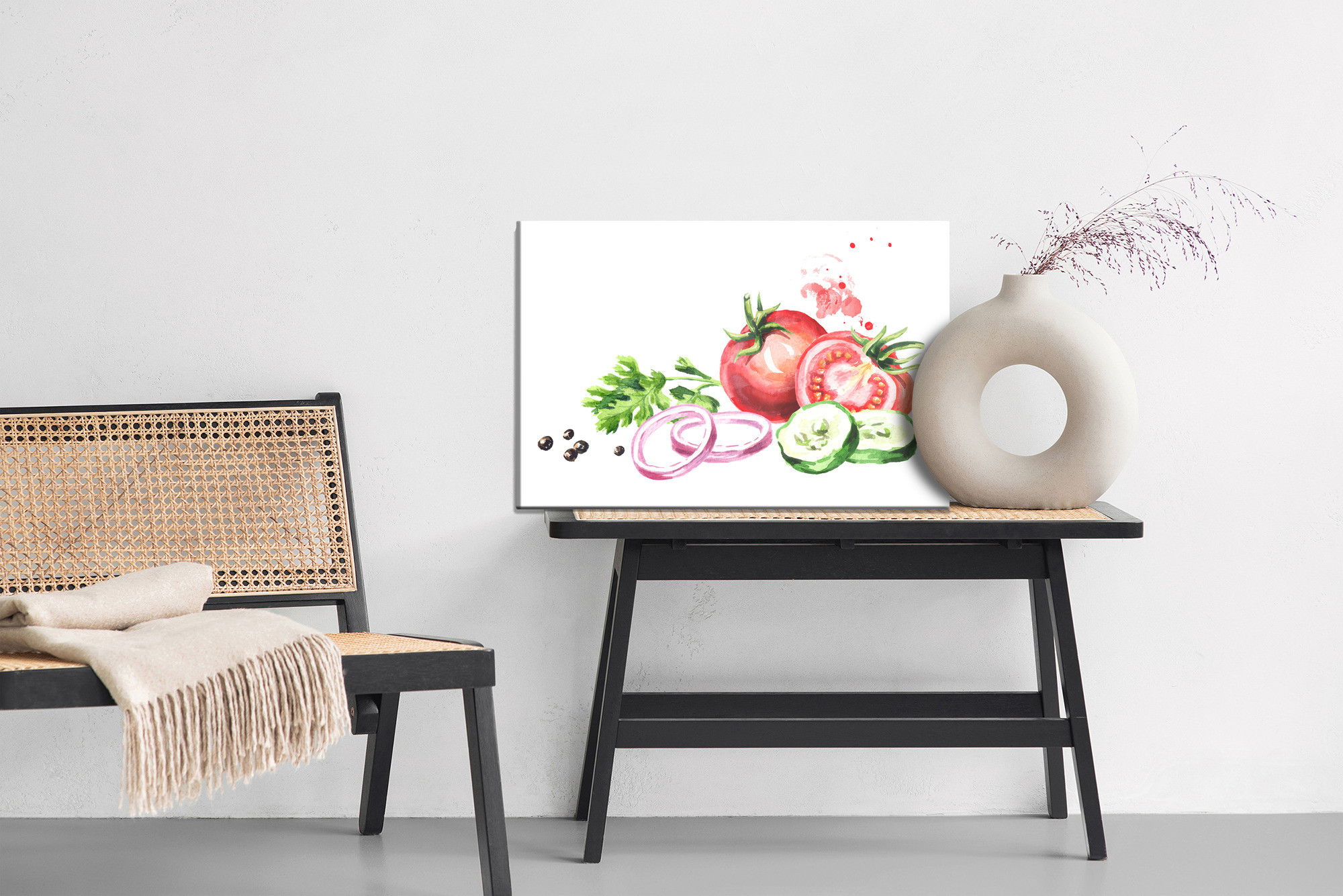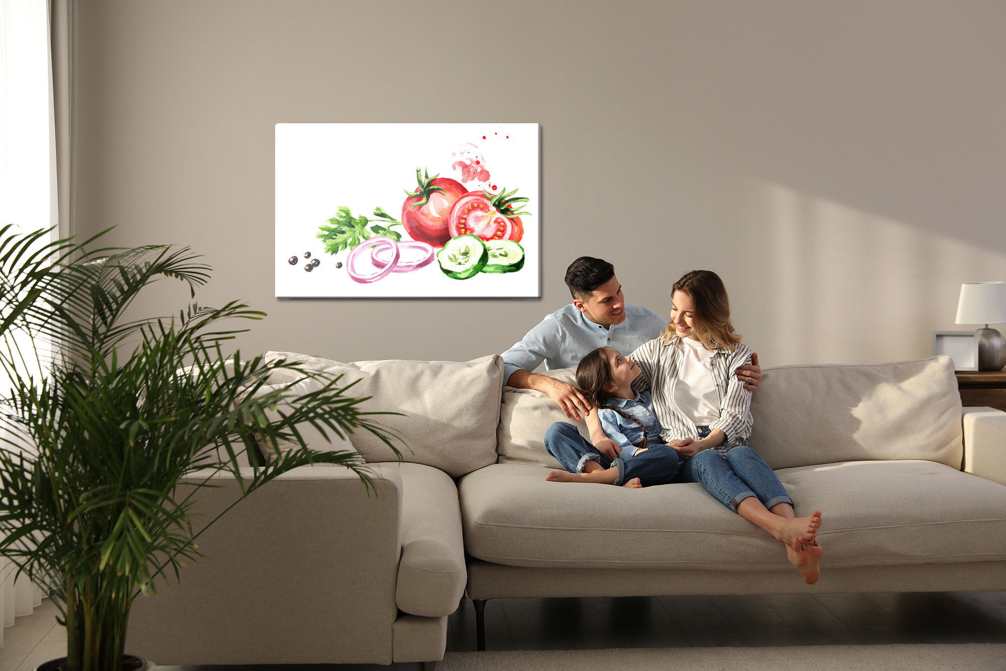 Motivet Tomatoes with herbs återges med hög färgprecision och detaljrikedom tack vare HP Latex-teknologi. Trycket sker med vattenbaserade, luktfria och GREENGUARD Gold-certifierade bläck som ger en upplösning på upp till 300 DPI. Färgerna är UV-beständiga och behåller sin styrka även i ljusa rum, vilket gör tavlan lämplig för både hem- och offentliga miljöer.
