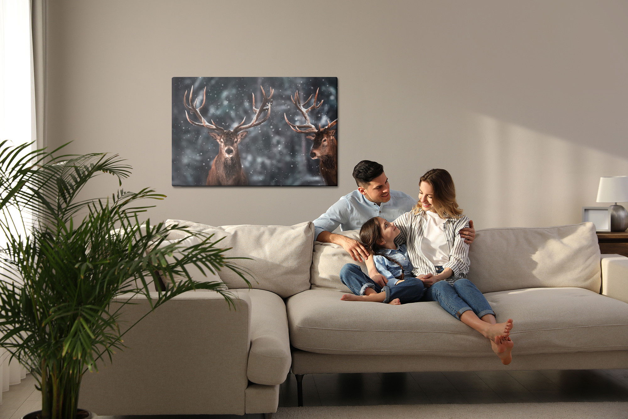 Varje tavla monteras på en massiv fururam. Format upp till 70×50 cm har en ram på 15 mm, medan format från 90×60 cm och uppåt har en ram på 20 mm. Den exakta dukspänningen gör att tavlan håller sin form över tid. Motivet Two magnificent stags trycks runt hela ramen vilket ger ett stilrent galleriuttryck där tavlan är lika vacker från sidan som framifrån. Kombinationen av rak dukspänning, rena linjer och korrekt tryck ger en professionell finish.