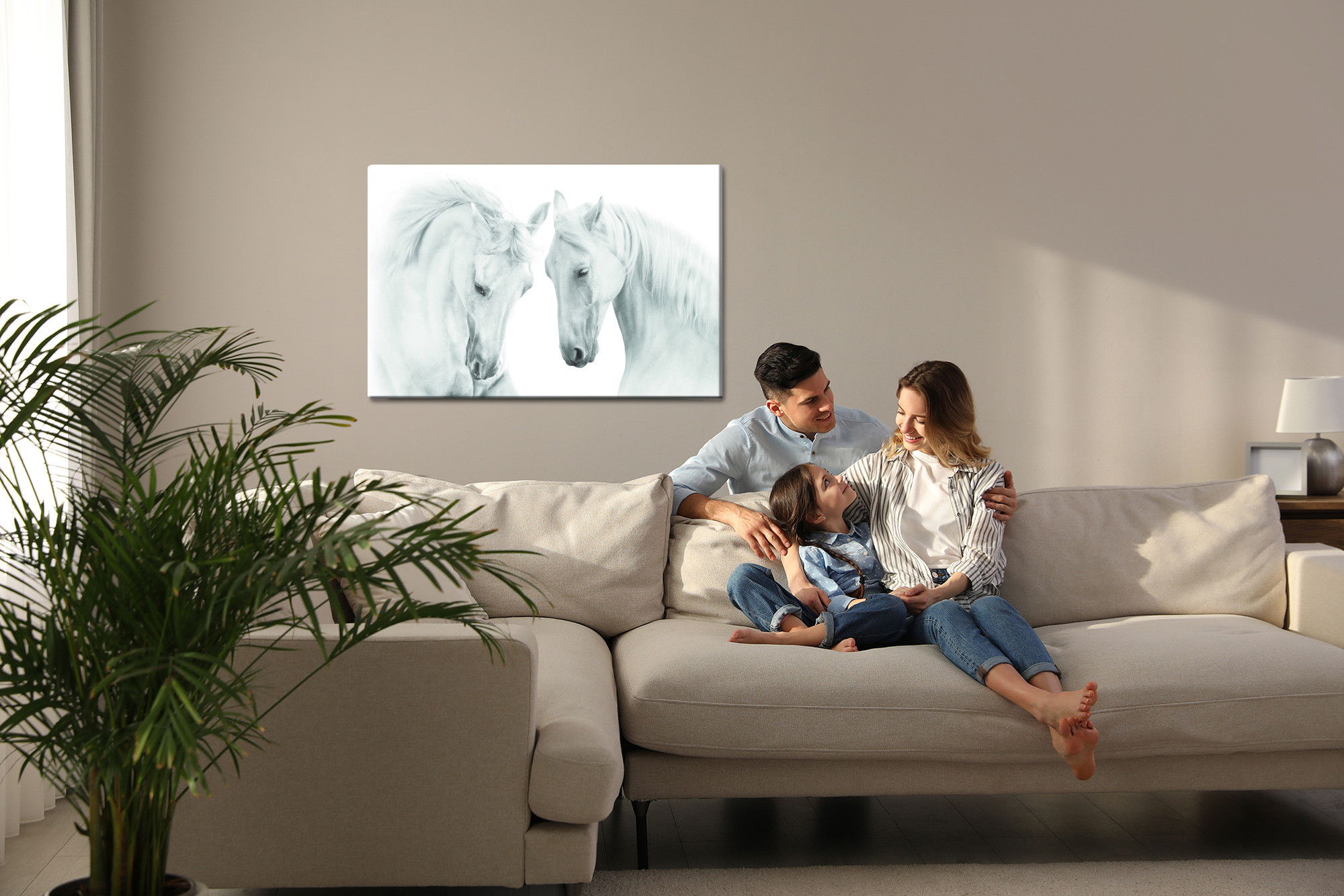 Varje tavla monteras på en massiv fururam. Format upp till 70×50 cm har en ram på 15 mm, medan format från 90×60 cm och uppåt har en ram på 20 mm. Den exakta dukspänningen gör att tavlan håller sin form över tid. Motivet Two white horses trycks runt hela ramen vilket ger ett stilrent galleriuttryck där tavlan är lika vacker från sidan som framifrån. Kombinationen av rak dukspänning, rena linjer och korrekt tryck ger en professionell finish.