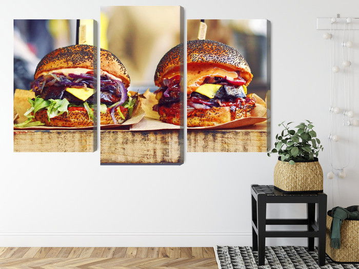 Med en ljuddämpande tavla Vegan burgers från SilentDirect får du en kombination av genomarbetad bildkvalitet och akustiklösning. Tavlan byggs på en canvastavla med fururam där insidan fylls med en kärna av återvunnen polyester som reducerar efterklang.