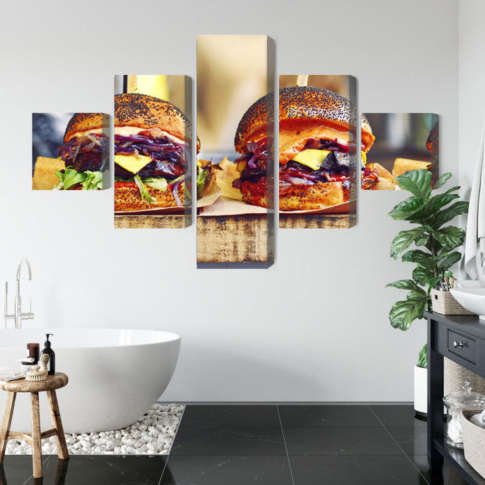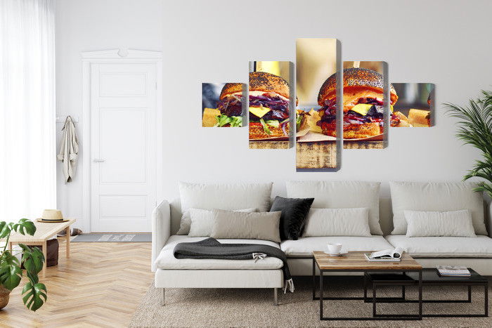 SilentDirects ljuddämpande tavla Vegan burgers kombinerar ett högupplöst motiv med avancerad akustikteknik. Varje tavla monteras i Sverige och bygger på en stabil canvastavla med fururam, där insidan av ramen fylls med en ljudabsorberande kärna av återvunnen polyester. Konstruktionen gör tavlan till ett både estetiskt och funktionellt inslag i rummet.